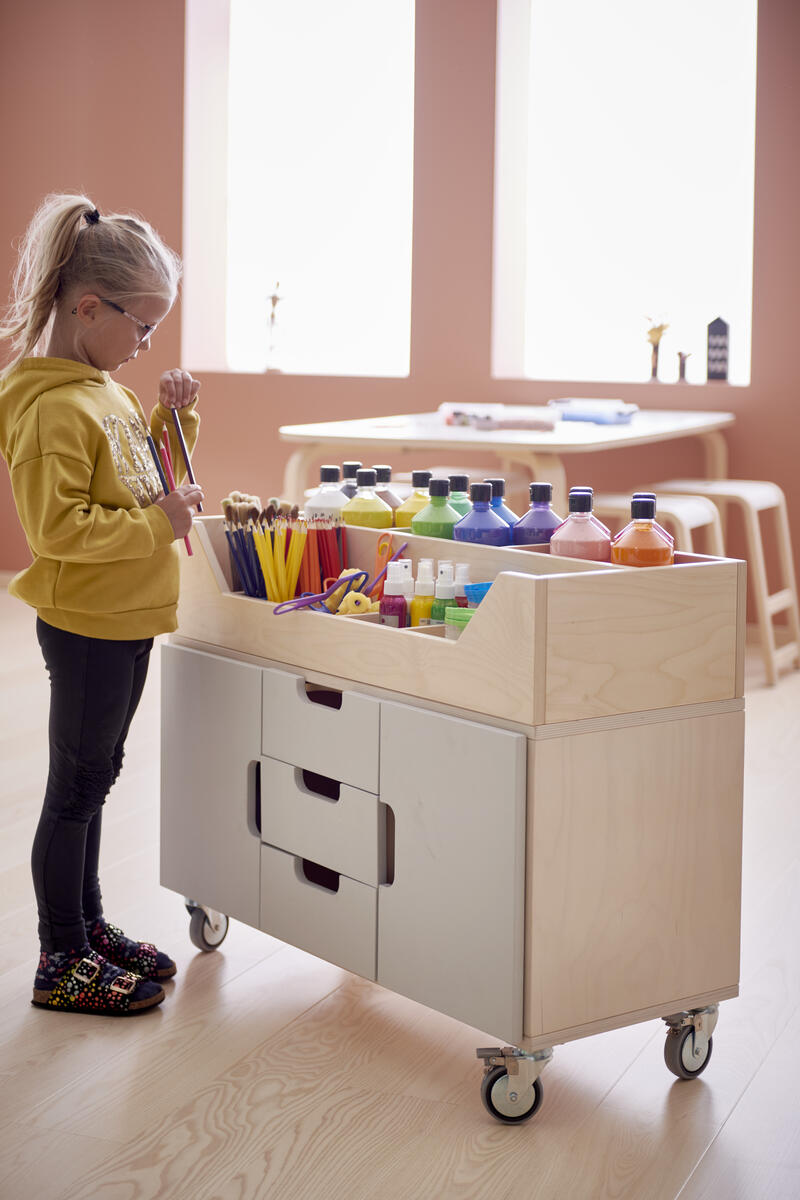 Praktisk og stabil oppbevaringsvogn med låsbare hjul. Rominndelt med plass til A2, A4 og A6 papir. Av hvitpigmentert bjørk kryssfiner. Mål: 93x64xh88 cm.