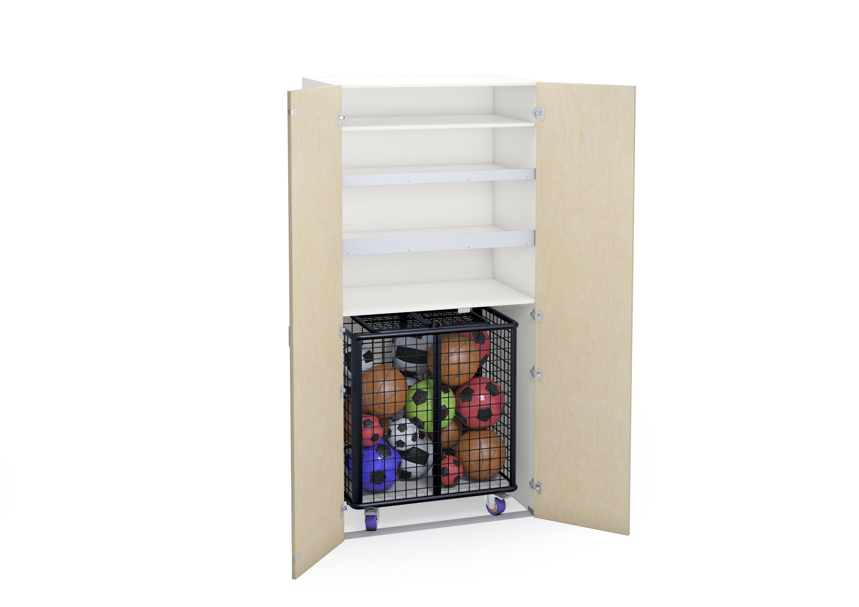 Materialskap for sportsutstyr med stamme i direktelaminat. Fronter i direktelamninat elelr høytrykkslaminat. Inneholder hyller og et rom for oppbevaringsvogn 74980. 2 tette dører med espanjolett (inkl. 2 nøkler). dørene kan åpnes i 170° vinkel. Mål: 100x60x210 cm