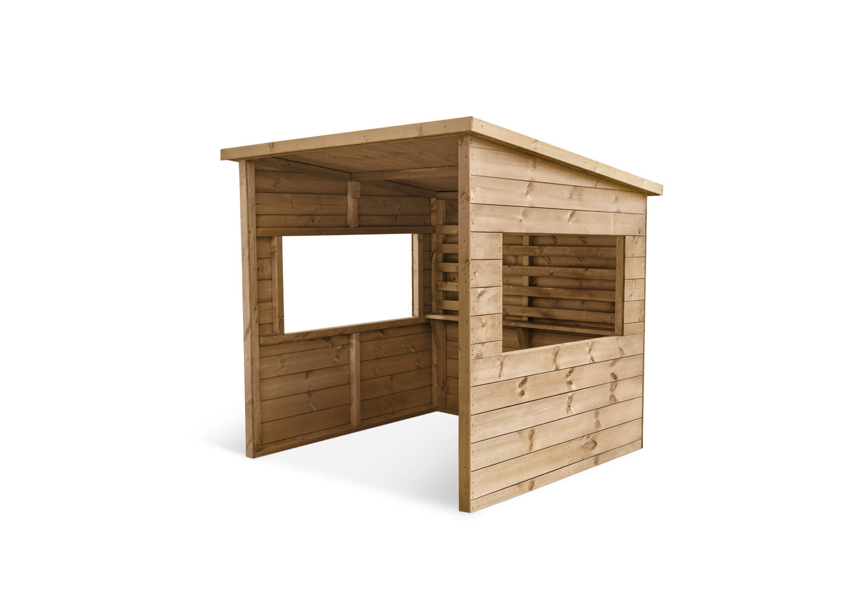 Et allsidig hus som beriker utendørsmiljøet og inspirerer til uendelig fantasifull lek. Det lille huset kan fungere både som butikk, markedsbod, et hjem eller et rolig lite hjørne. På forsiden er det et stort vindu som kan fungere som en disk, og det er også utstyrt med to tavler. Laget av FSC-sertifisert furu som er overflatebehandlet med en vannbasert lakk. For veggforankring trengs 2 stk av art.nr. 151133, eller for markforankring trengs 4 stk av 161297. Leveres umontert.