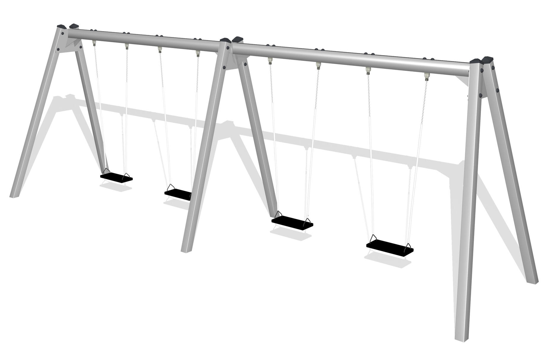 Komplett med 4 seter inkl. bolter og oppheng. Stolper og tverrligger av galvanisert stål. Krever minimalt med vedlikehold. Leveres komplett, men umontert. Med fundament. Mål L652xB185xH245cm. Areal L750xB652cm. Fallhøyde 150cm. Sikkerhetsområde 49 m²