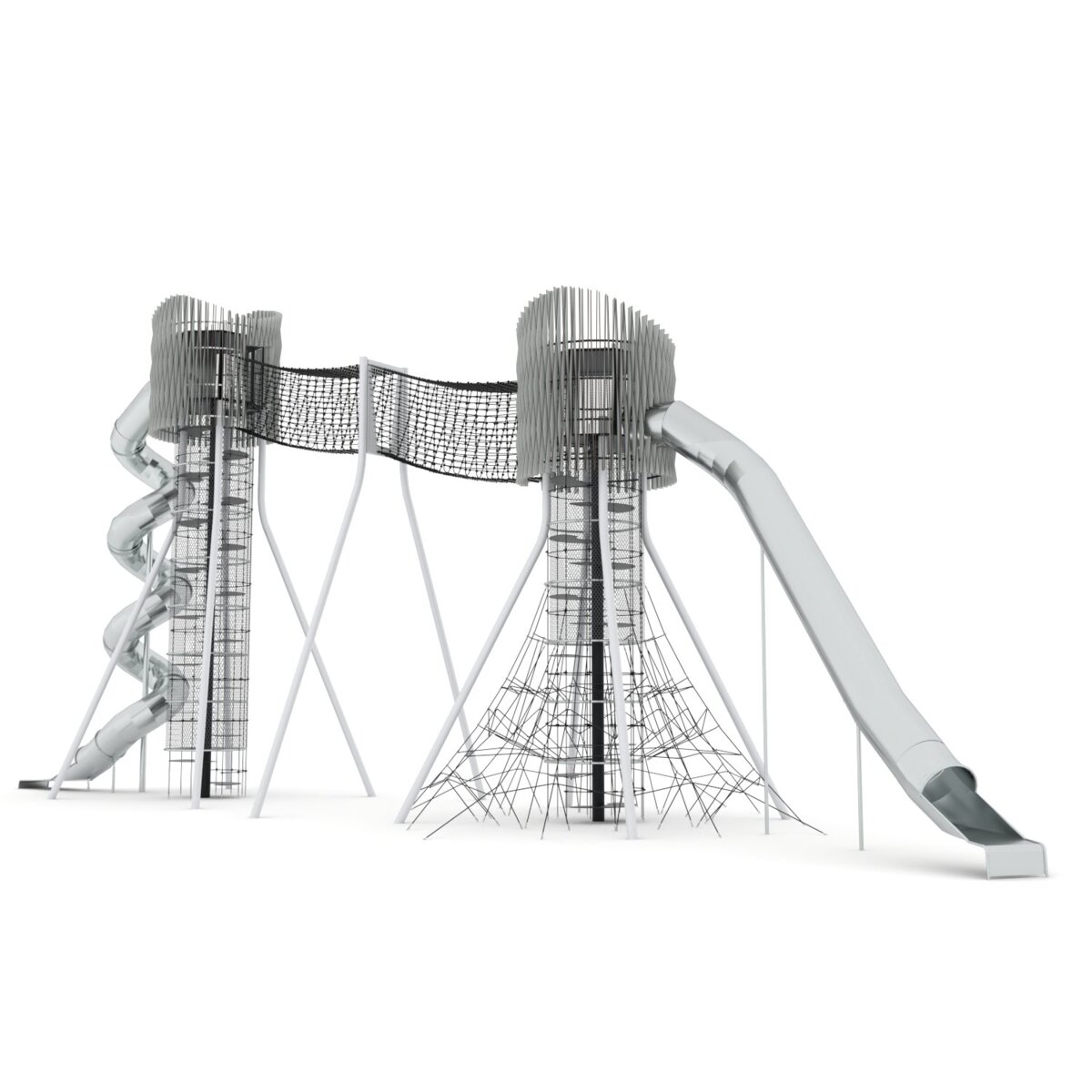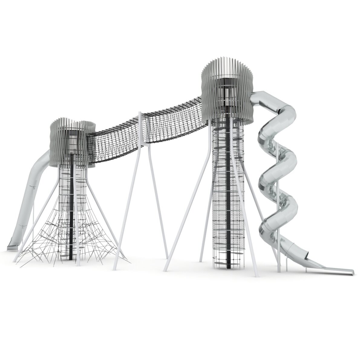 Å klatre høyt i tårn som nesten når opp til himmelen er både spennende og utfordrende. Gjennom klatring utvikler barna sin motorikk, koordinasjon, balanse og kroppsbevissthet. MAXX er et modulært system av høyeste kvalitet. Denne modellen består av to høye tårn, klatrenett, spiraltrapp, hengebro mellom tårnene og en lang spiral tunnelsklie samt en tubesklie. Modulene er laget av varmgalvanisert stål med innslag av robinia og UV-bestandig farget polykarbonat. Ved montering/installasjon skal alltid manualen som medfølger produktet ved levering benyttes. Den nyeste versjonen er tilgjengelig på forespørsel.
