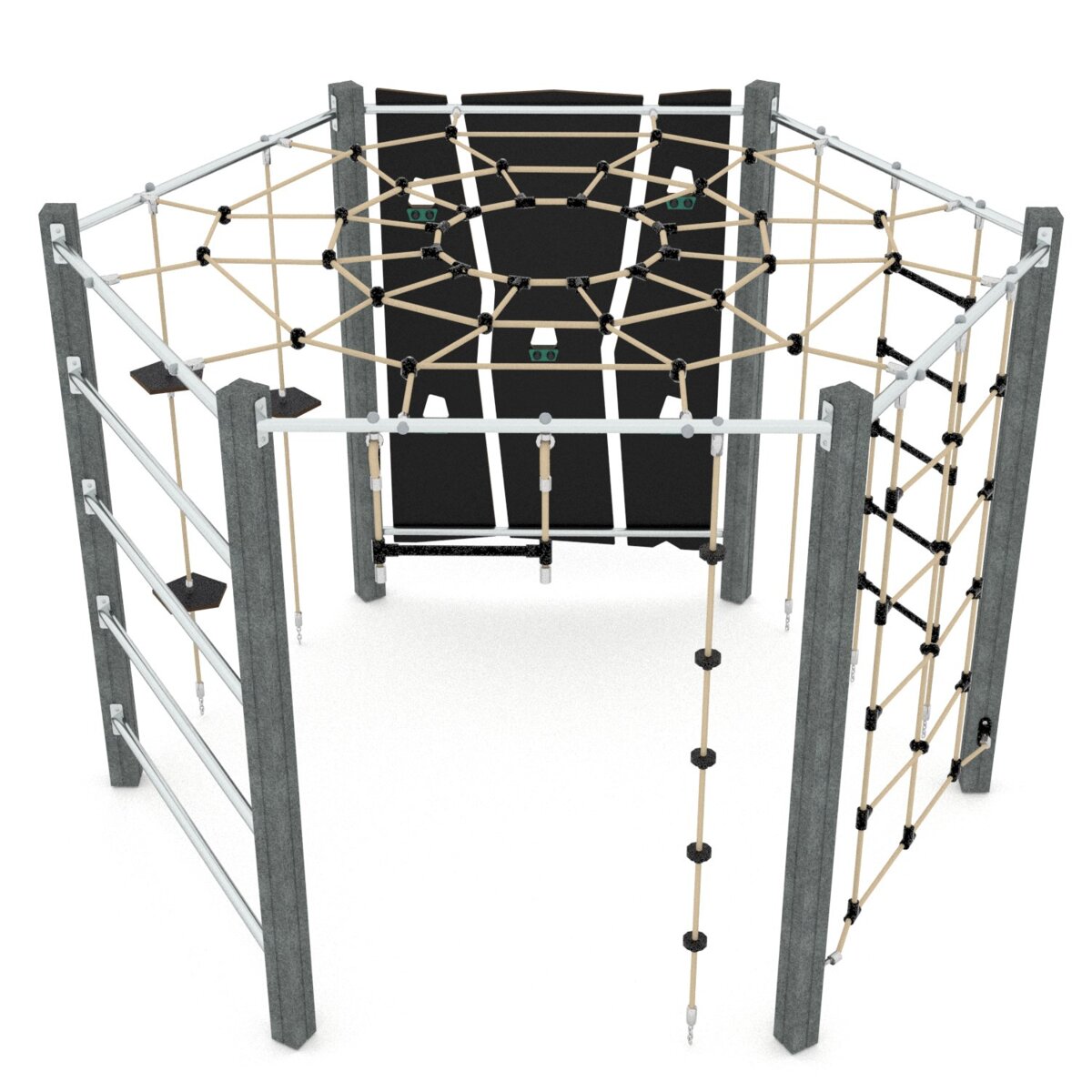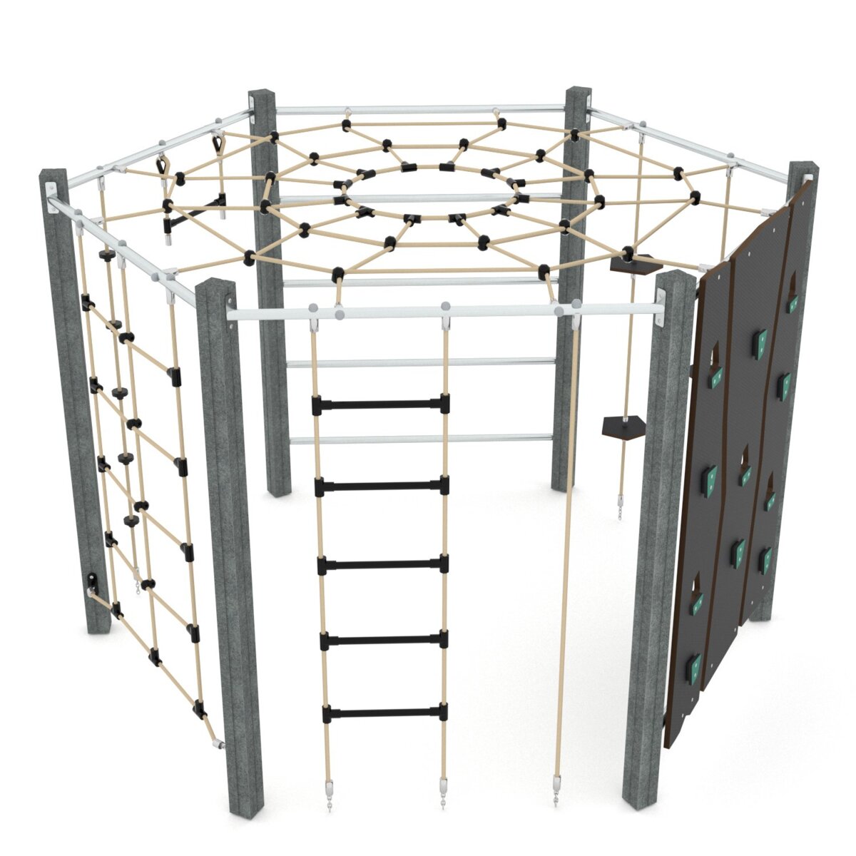 Klatrestativ med ulike balanse og klatreøvelser. HDPE panel i multicolor, øvrige farger i HPL. Ved montering/installasjon skal alltid manualen som medfølger produktet ved levering benyttes. Den nyeste versjonen er tilgjengelig på forespørsel.