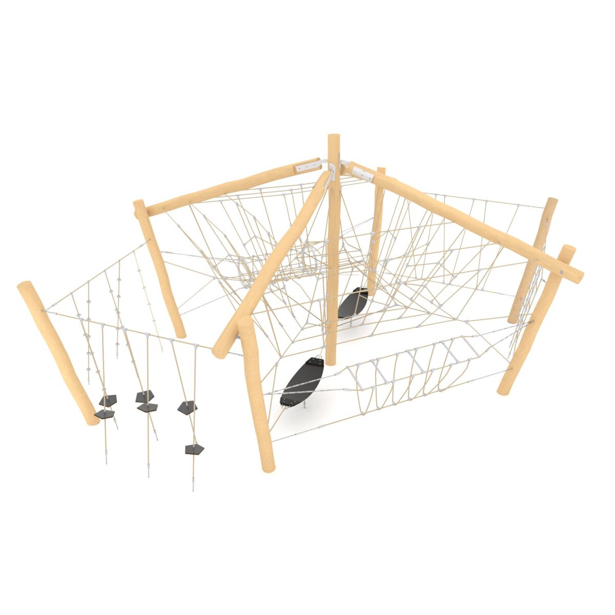 Trebom med klatrenett på hver side. Til lekeplasser. Fra 2 år. Mål: L200xH99 cm. Sikkerhetssone: 23,5 m². Arealbehov 500x330 cm. Fallhøyde: 99 cm. Monteringstid: 1 person a 3 timer.