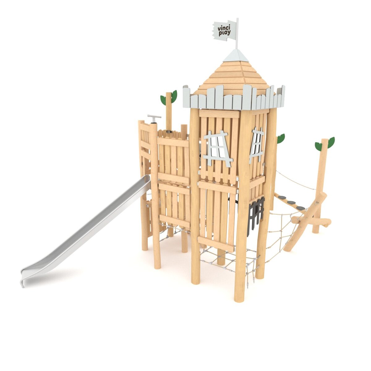 Denne solide borgen kombinerer høy lekeverdi og sosiale rollelek med flere ulike aktivitetsmuligheter. Barna setter pris på den aktive og eventyrlige leken som oppmuntrer til bevegelsesglede. På borgen er det mulighet for å klatre i flere forskjellige nett, gå på line, skli ned sklien, klatre opp stigen, speide etter drager eller riddere å beseire med kikkerten. Robinia smelter fint inn i utemiljøet og gir et mykt og naturlig inntrykk. Det er en tresort med høy motstandsdyktighet mot værpåvirkning og har evnen til å absorbere minimalt med vann og utmerker seg gjennom sin ekstremt lange holdbarhet. Klatrenett og tau av stål, dekket med flettet polypropylen. Sklie og feste til klatrenett i rustfritt stål. Klatrestolper i robinia med klatregrep laget av sklisikkert HT-laminat og stål. Monteres i henhold til installasjonsmanualen. Ved montering/installasjon skal alltid manualen som medfølger produktet ved levering benyttes. Den nyeste versjonen er tilgjengelig på forespørsel.