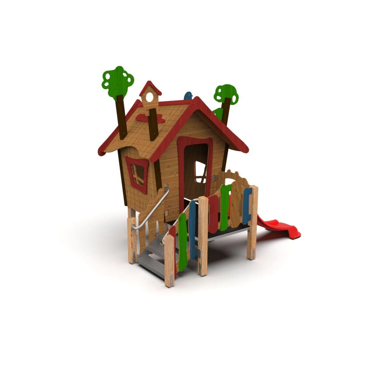 Trollskogen er et sjarmerende og eventyrinspirert lekehus som passer perfekt i barnehagens utemiljø. Inne finnes det benk og bord som skaper et koselig miljø for rollelek og samspill. Ved dørkarmen sitter det en liten «ringeklokke» som gjør leken enda mer virkelighetstro. Ved den åpne terrassen finnes en herlig rutsjebane å suse ned.