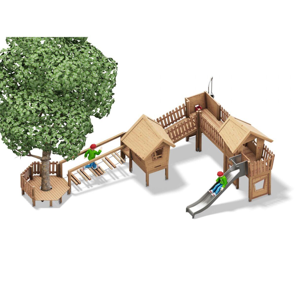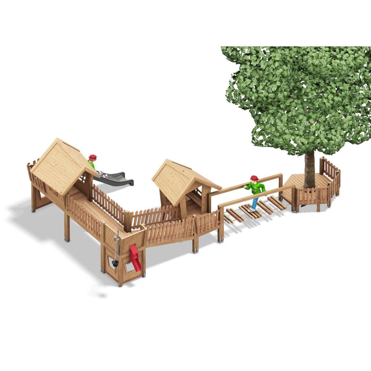 En stor og allsidig konstruksjon som gir barna en komplett lekeopplevelse i harmoni med naturen. Dette multilekapparatet har 4 tårn i ulike høyder, sammenkoblet med flere utfordrende lekeelementer. Her finnes balansebom, tau-bro, klatrevegg, klatrenett, skrå rampe, tau-stige, sklie, stangrutsj og en tunnelrutsj. Det robuste markfestet i stål holder stolpene av limtre over bakken og beskytter mot fukt og slitasje. Tak og sklie i rustfritt stål er tilgjengelig på forespørsel.