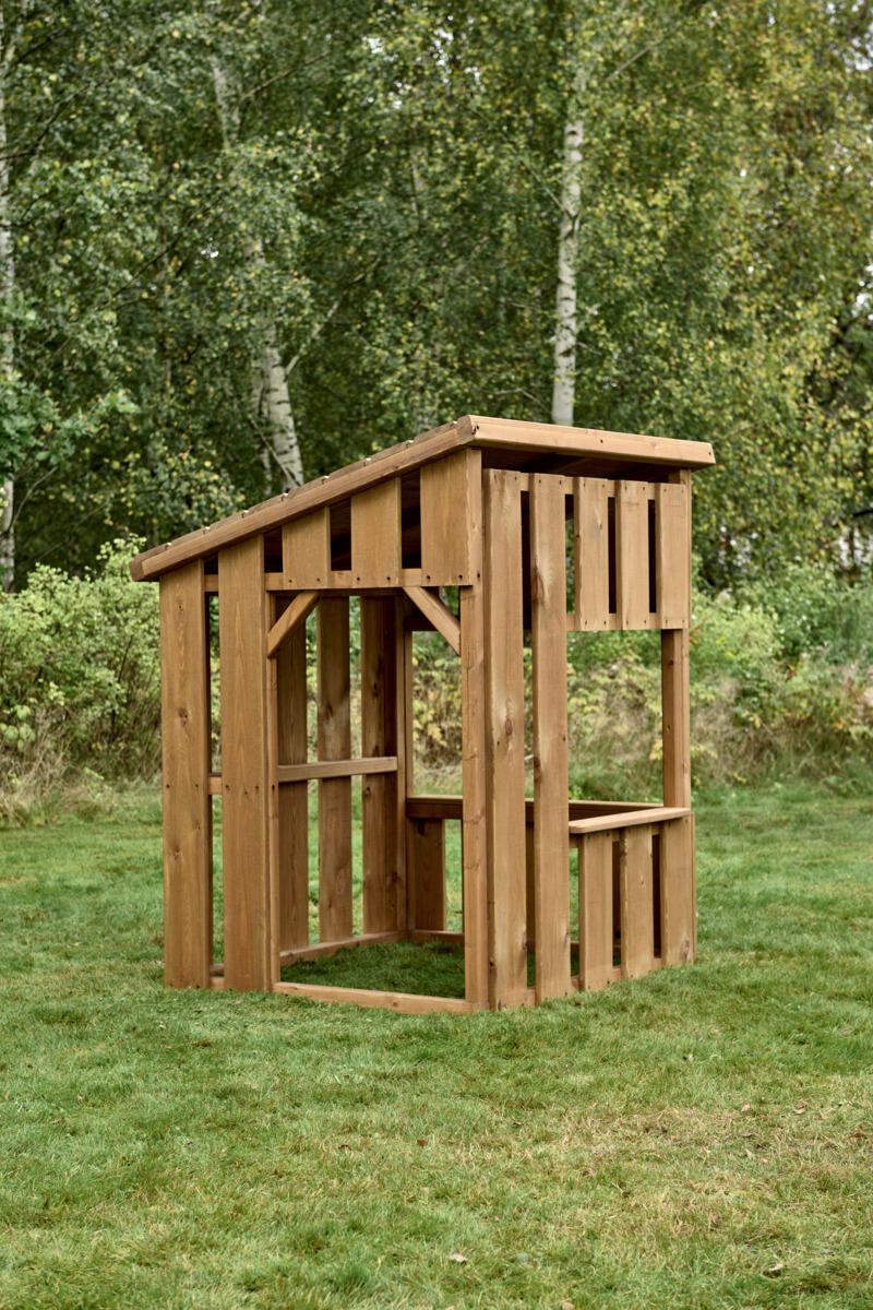 Et åpent lekehus som passer for både sosiale og fantasifulle leker, eller som et sted å trekke seg tilbake til hvis du vil være for deg selv en liten stund. Den åpne utformingen gjør også miljøet oversiktlig for pedagogen og kan skape trygghet for barna. Laget i solid, PEFC-merket furu. Mål: 128x131x143 cm. Leveres umontert. Løsning for nedgravd bakkeforankring eller overflatemontering velges som tilvalg.