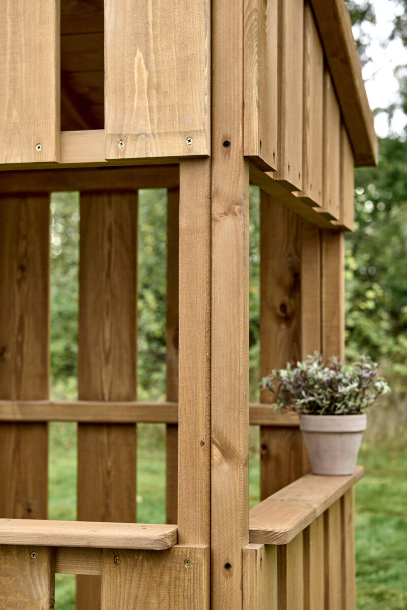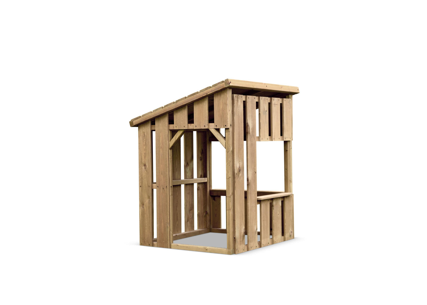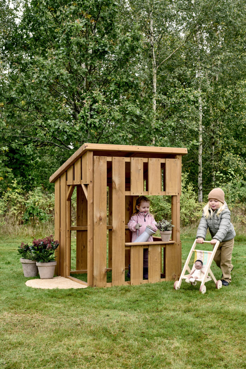 Et allsidig hus som beriker utendørsmiljøet og inspirerer til uendelig fantasifull lek. Det lille huset kan fungere både som butikk, markedsbod, et hjem eller et rolig lite hjørne. På forsiden er det et stort vindu som kan fungere som en disk, og det er også utstyrt med to tavler. Laget av FSC-sertifisert furu som er overflatebehandlet med en vannbasert lakk. For veggforankring trengs 2 stk av art.nr. 151133, eller for markforankring trengs 4 stk av 161297. Leveres umontert.