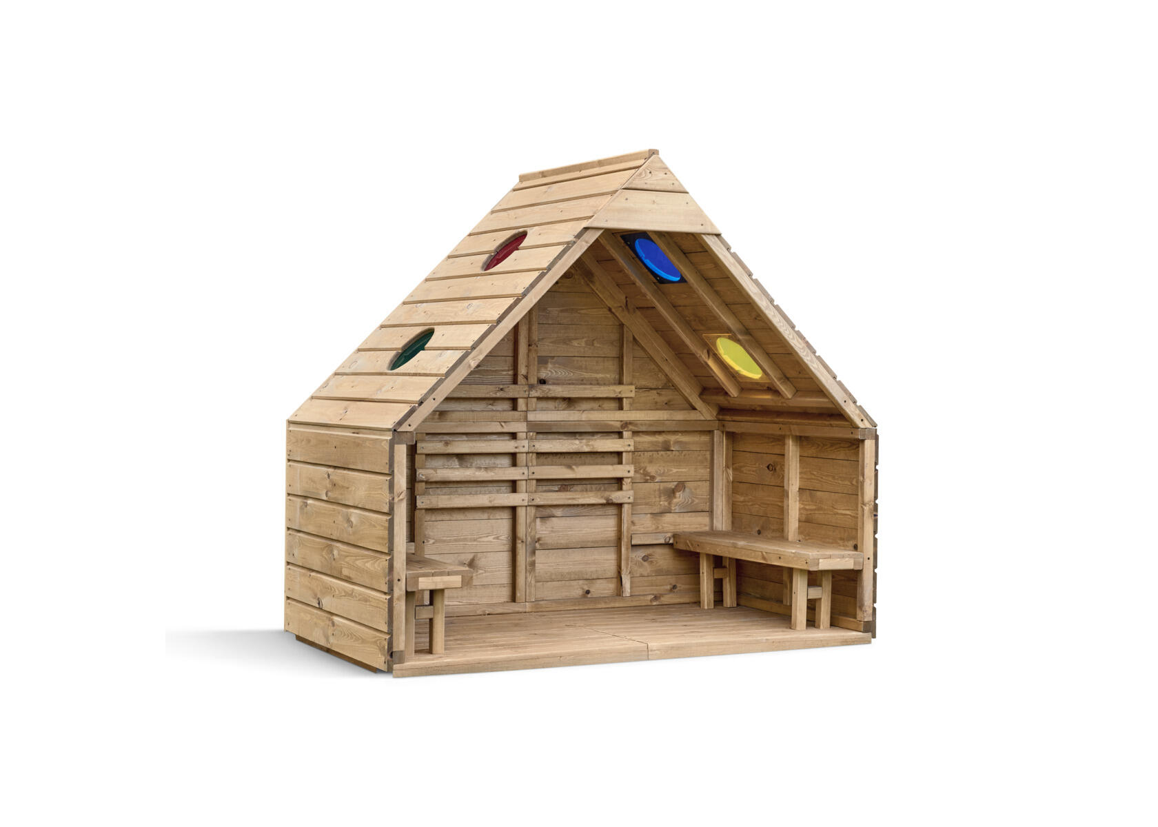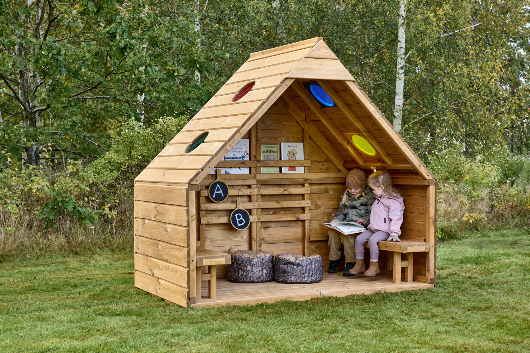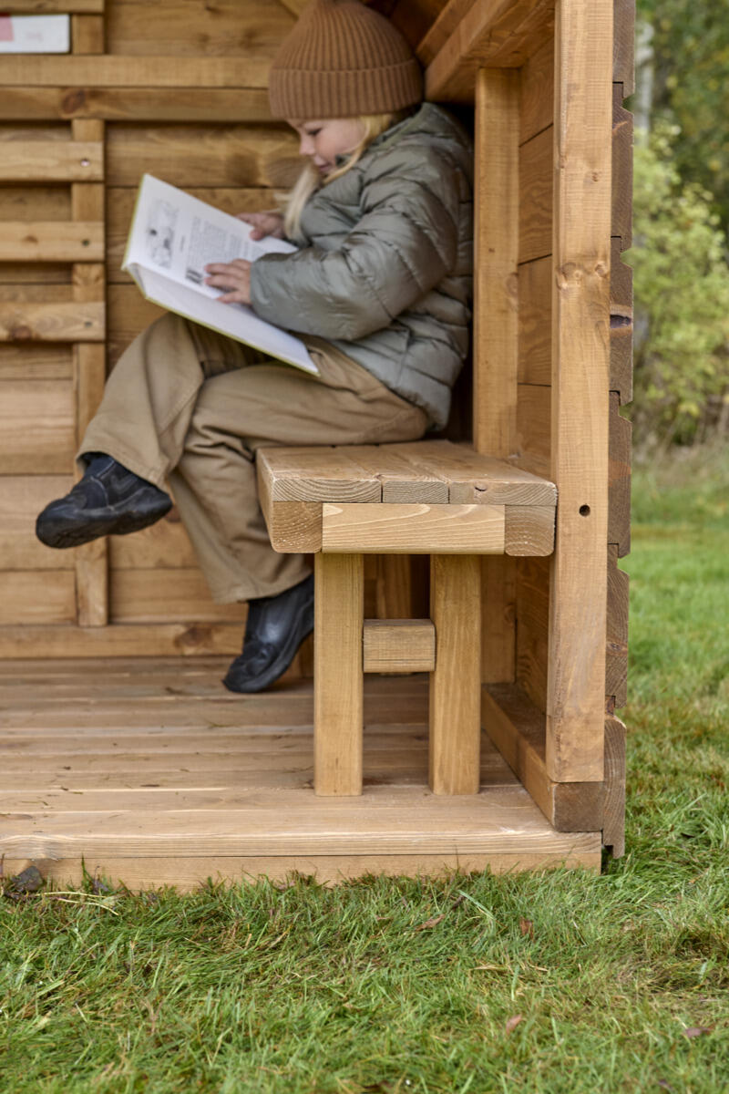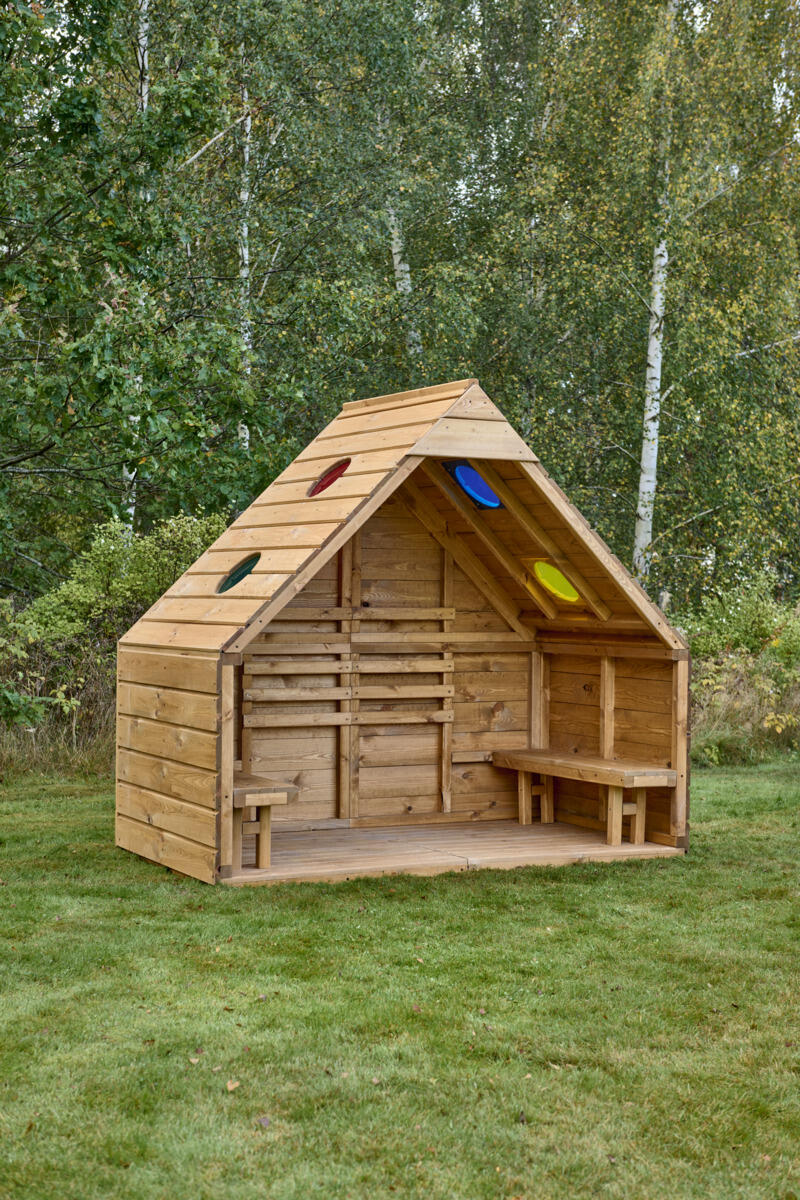 Skap et koselig og inspirerende sted utendørs for både rollelek, samspill og rolige stunder. Det fargede pleksiglasset i det runde takvinduet slipper inn lys og farger, og skaper fantastiske sanseopplevelser som stimulerer det visuelle sansesystemet. Med sin generøse høyde på 189 cm og to innebygde benker, tilbyr den god plass for barn til å sitte og lese, leke eller bare slappe av sammen. Bakveggen har trespiler for enkel oppheng av bøker eller materiell til kreativ læring. Laget av FSC-sertifisert furu, overflatebehandlet med vannbasert lakk. For best holdbarhet anbefales å behandle produktet årlig. For forankring i bakken trengs 4 stk av 151134, eller 151133 for overflatemontering. Leveres umontert.