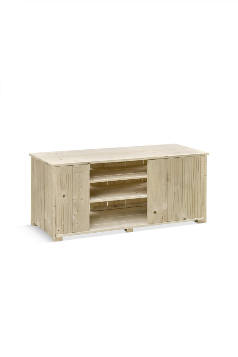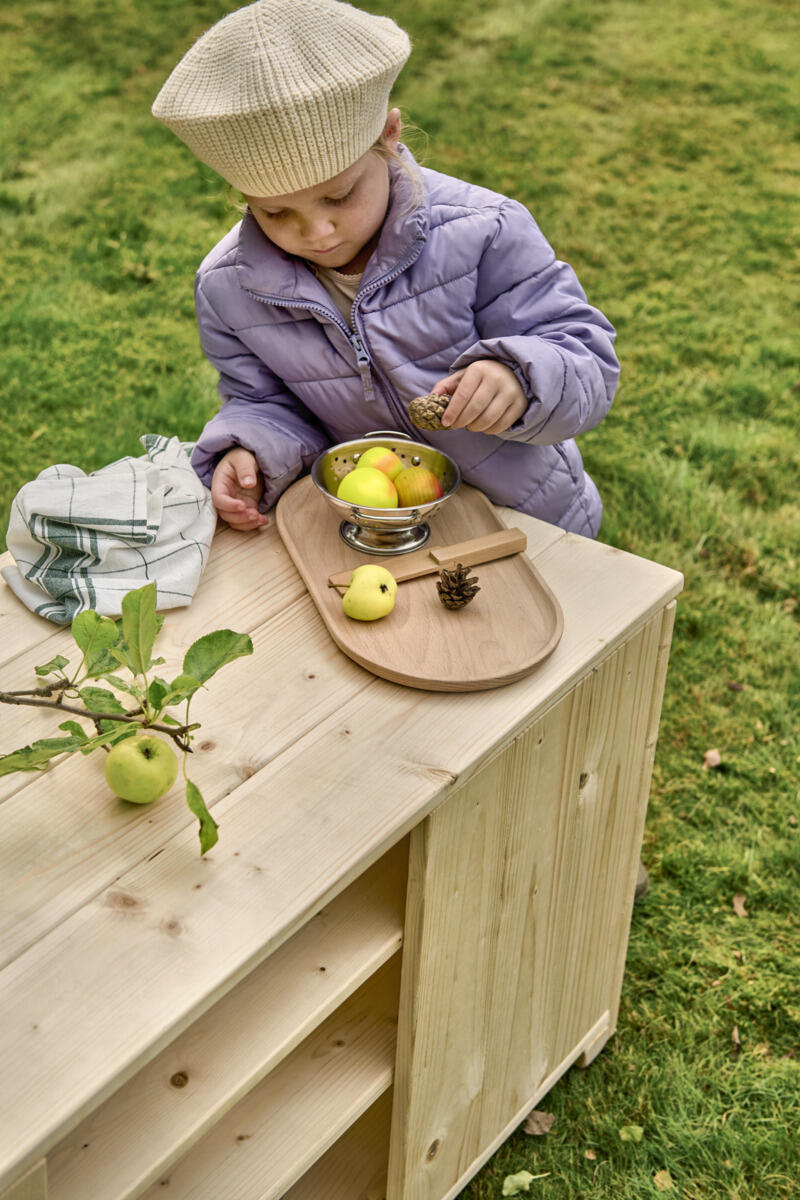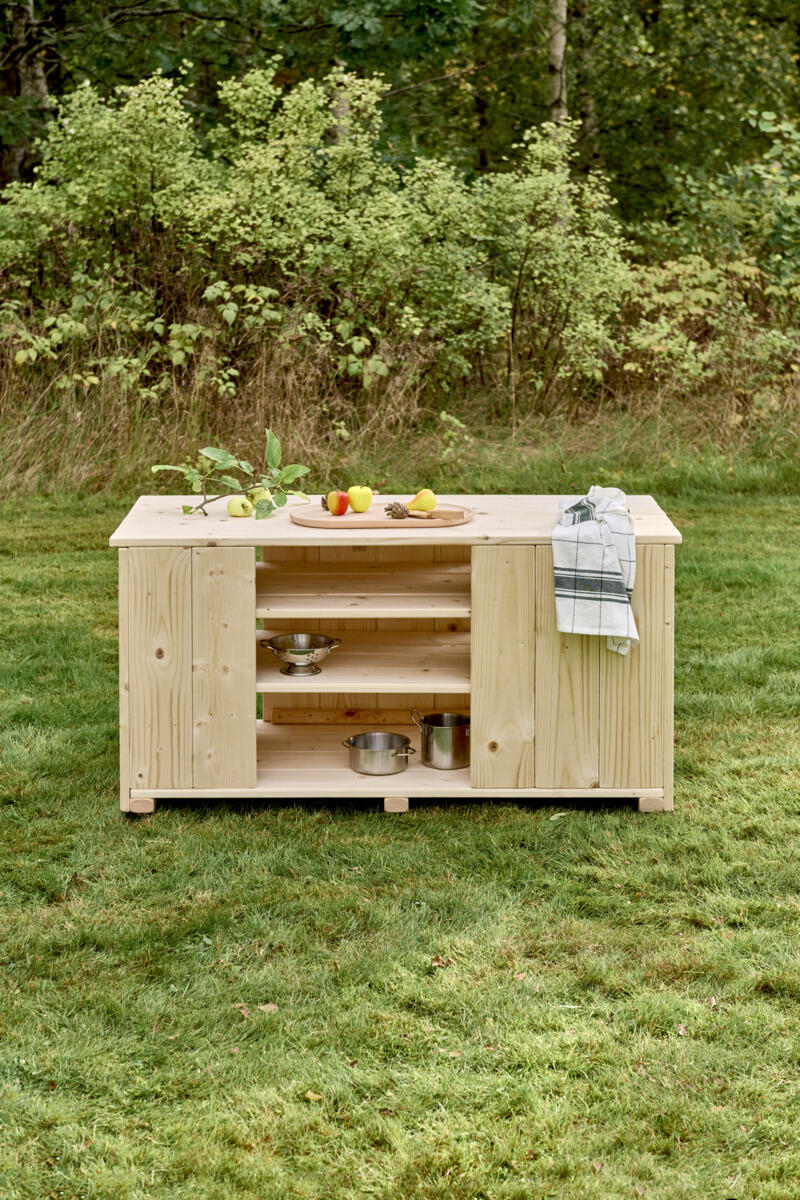 Skap en innbydende plass for kreativ rollelek i barnehagens utemiljø. Denne store og robuste arbeidsbenken gir en god arbeidsflate for å utforske, eksperimentere eller bake sandkaker. Arbeidsbenken blir et verdifullt tilskudd til utekjøkkenet og bidrar til en mer variert og engasjerende lekeplass. De åpne hyllene gjør det enkelt for barna å nå alt de trenger selv, og oppmuntrer både til selvstendig lek og samspill med andre. Benken fungerer også perfekt som samlingspunkt, for å øve samarbeid eller som snekkerbenk. Laget av massiv FSC-sertifisert furu med marknære deler i slitesterkt robiniatre for økt levetid. Arbeidsbenken finnes i både oljet og råtebeskyttet variant. Leveres ferdig montert.