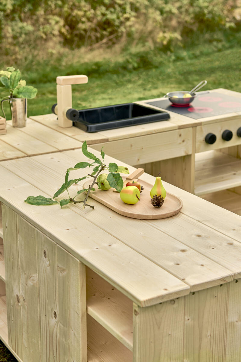 Bordet med nedsenkede baljer av LLDPE og TPE løfter uteleken. Nå blir det enkelt å bygge og leke med jord, sand og vann. Barna kan øve på samarbeid, sortering, figurlek etc.