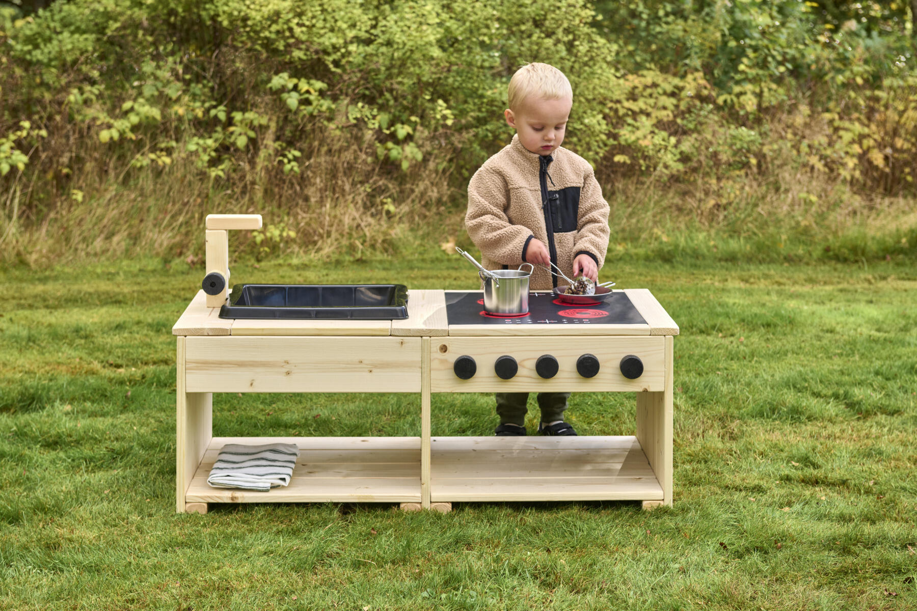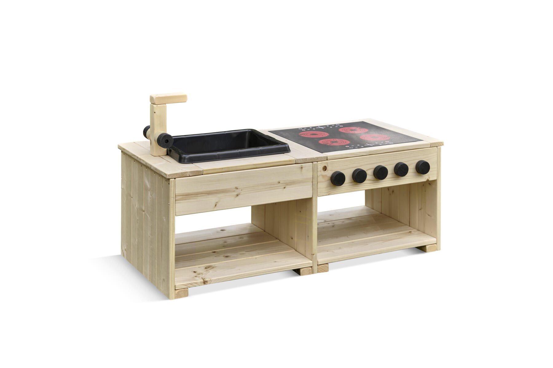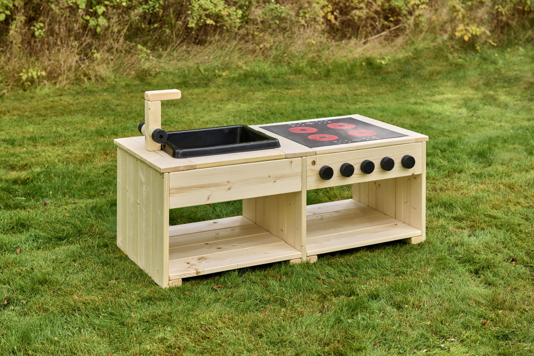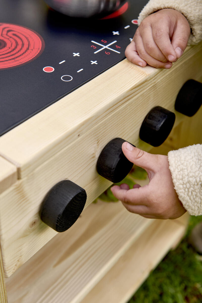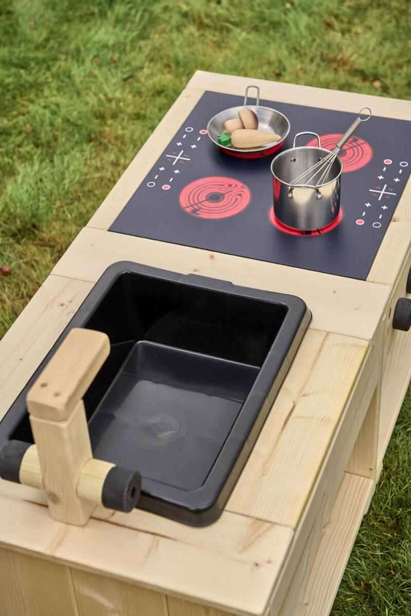 Dette robuste utekjøkkenet skaper en inspirerende utemiljø for åpen og fantasifull rollelek. Her oppmuntres barna til å utforske, blande og eksperimentere med klissete matlaging i sand og vann. Kjøkkenøya er utstyrt med en solid komfyr med induksjonsplate og dreibare knapper samt en vask med kran. Barnevennlige arbeidsflater og åpne hyller gjør det enkelt for barna å nå materialer og holde orden. Den nedsenkede kassen er lett å løfte ut for enkel rengjøring. Laget av massiv FSC-sertifisert furu med marknære deler i slitesterkt robiniatre for økt levetid. Kjøkkenøya finnes i både oljet og råtebeskyttet variant. Leveres ferdig montert.