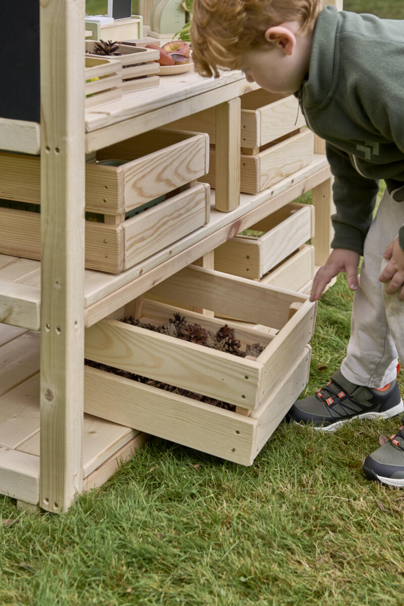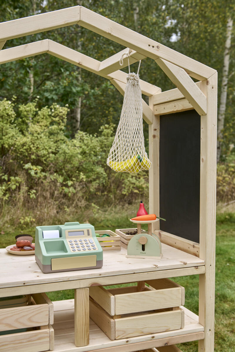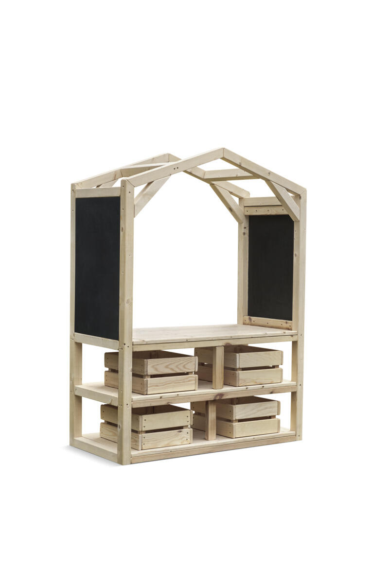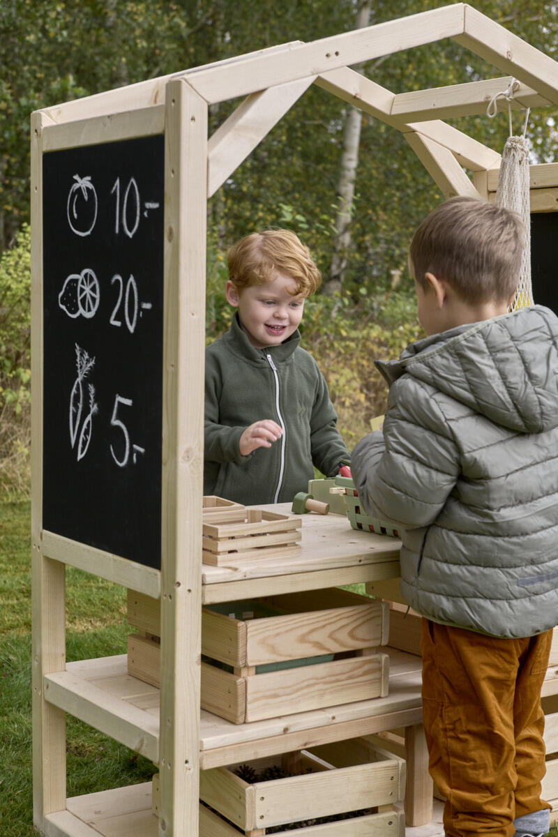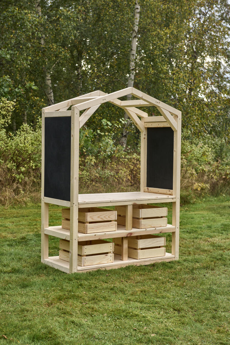 Denne stabile markedsboden blir et perfekt pedagogisk tilskudd som stimulerer både rollelek og læring i utemiljøet. Her får barna mulighet til å øve på kommunikasjon, samspill, å bytte på omgangvente på tur og de matematiske begreper gjennom å handle, selge og organisere sin egen lille butikk. De åpne hyllene gjør det enkelt for barna å nå alt de trenger selv, noe som fremmer selvstendighet. Fire oppbevaringskasser i tre følger med og gir plass til lekeutstyr og varer. Laget av massiv FSC-sertifisert furu med marknære deler i slitesterkt robiniatre for økt levetid. Markedsstativet finnes i både oljet og råtebeskyttet variant. Leveres ferdig montert.