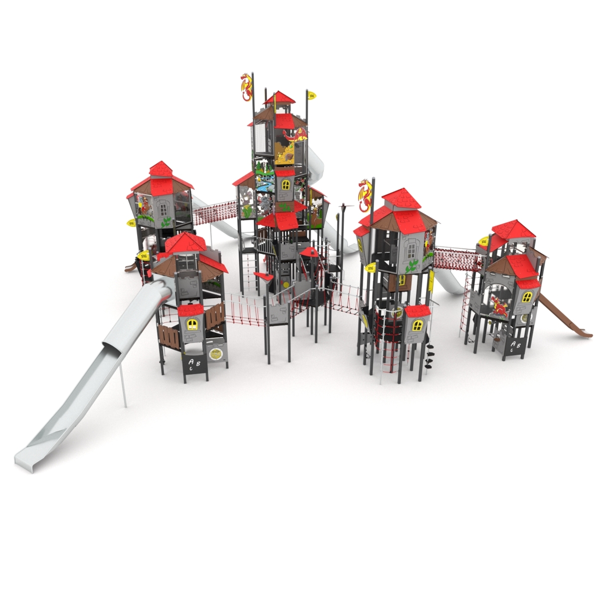 Lekeplass med 4 tårn, sklie, klatrevegg mm. Paneler i HDPE (multifarget) eller HPL (øvrige farger). Ved montering/installasjon skal alltid manualen som medfølger produktet ved levering benyttes. Den nyeste versjonen er tilgjengelig på forespørsel. Inkluderer markforankring K1.