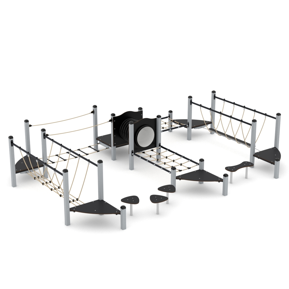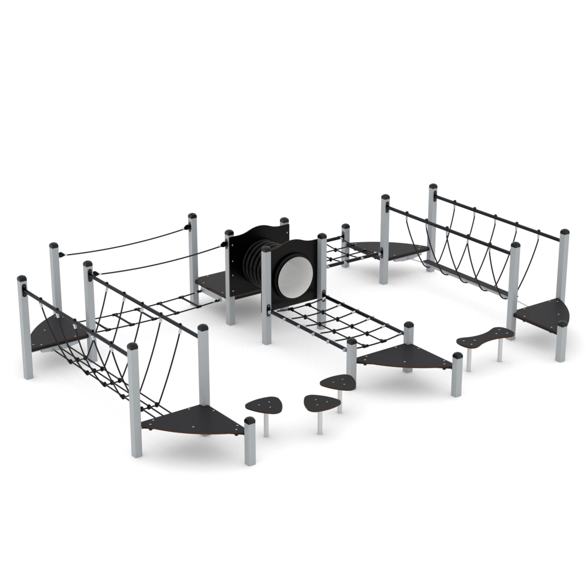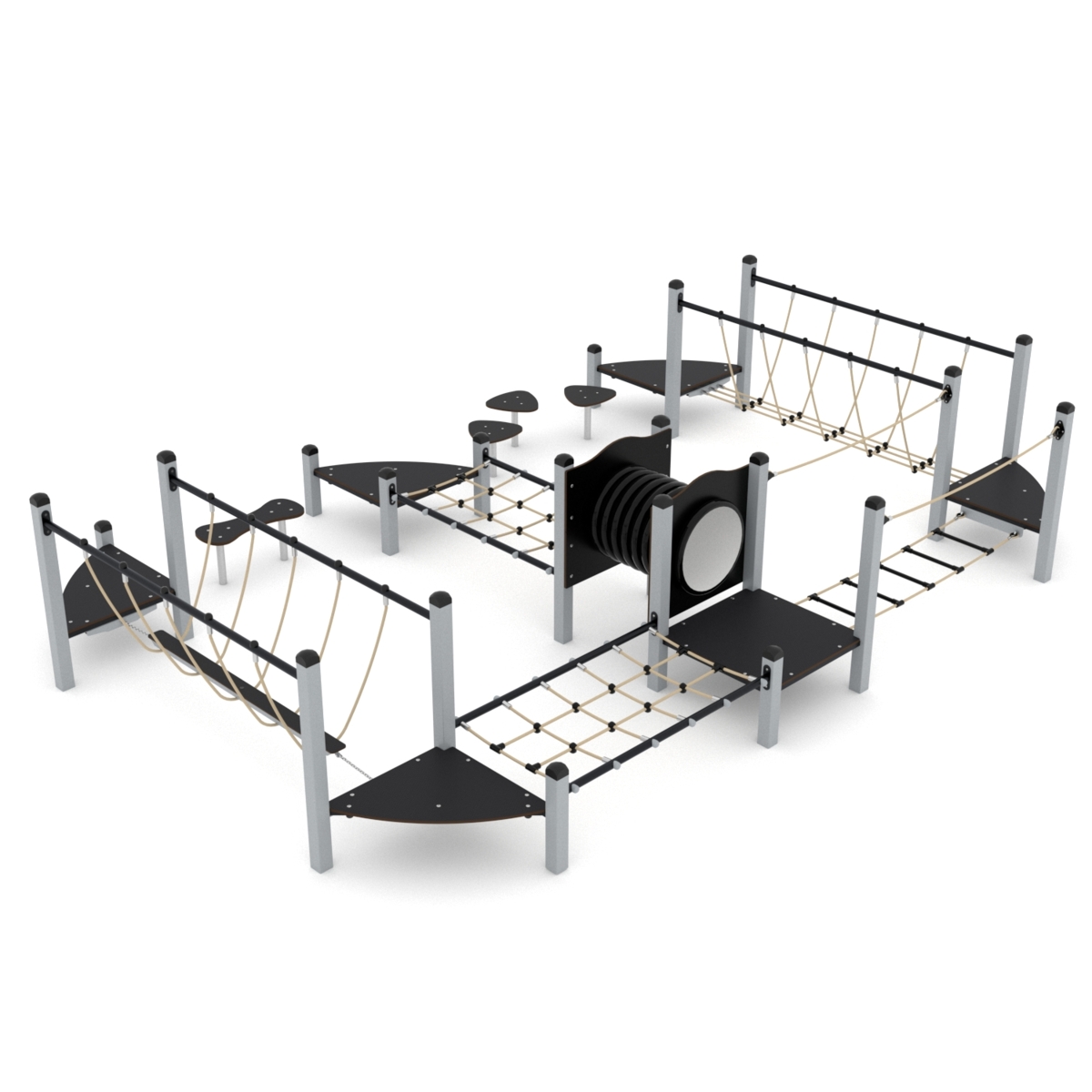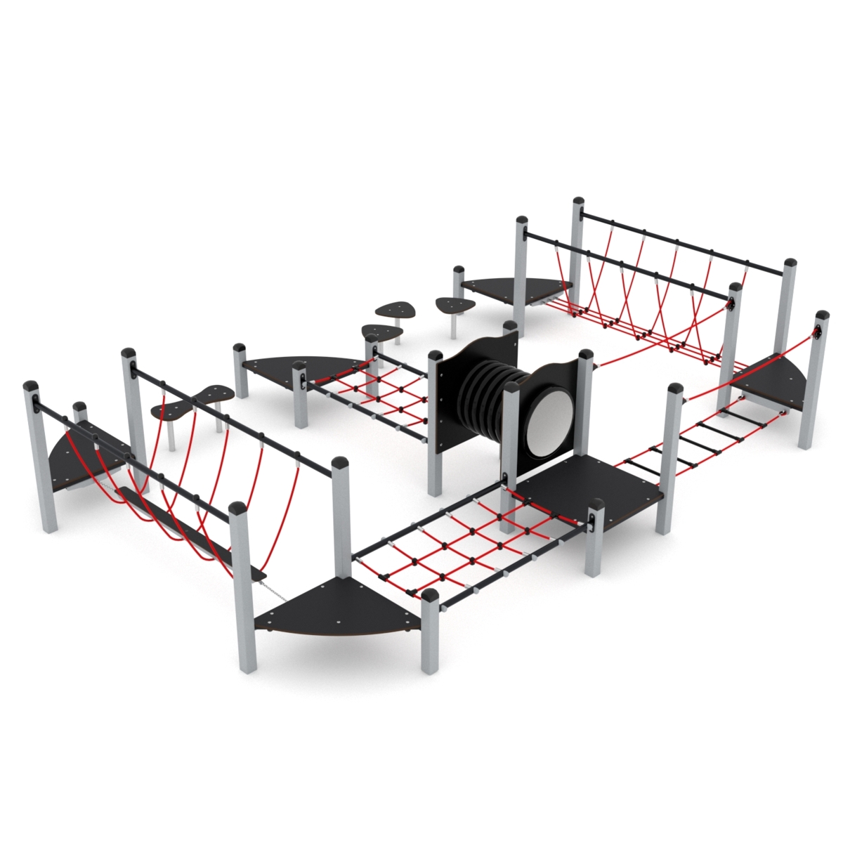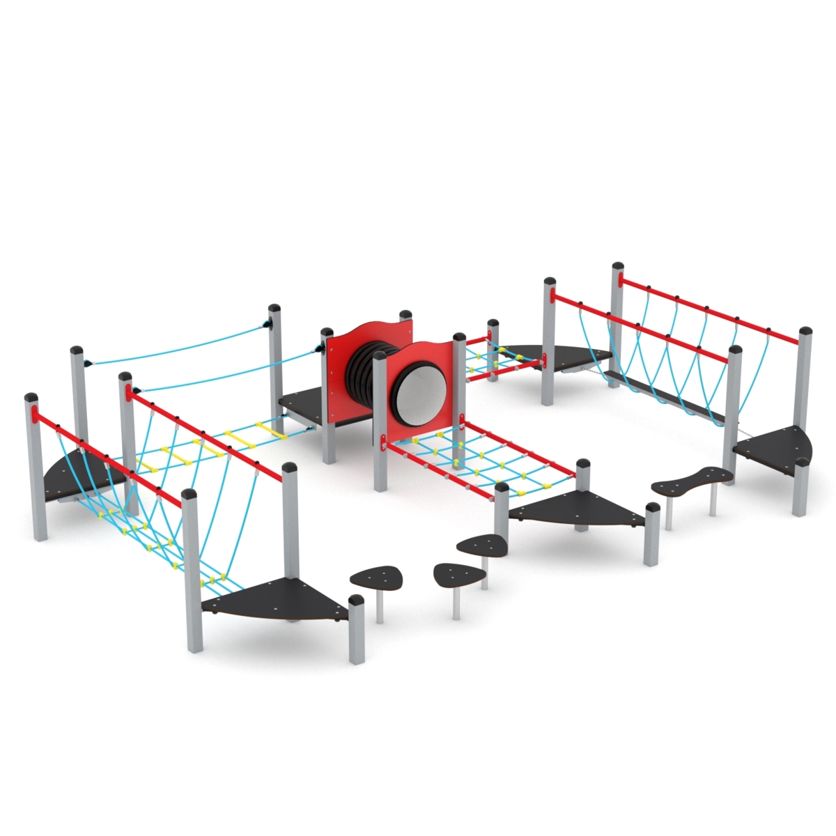 Klatrestativ med ulike balanse og klatreøvelser. HDPE panel i multicolor, øvrige farger i HPL. Ved montering/installasjon skal alltid manualen som medfølger produktet ved levering benyttes. Den nyeste versjonen er tilgjengelig på forespørsel. Inkluderer markforankring K1.