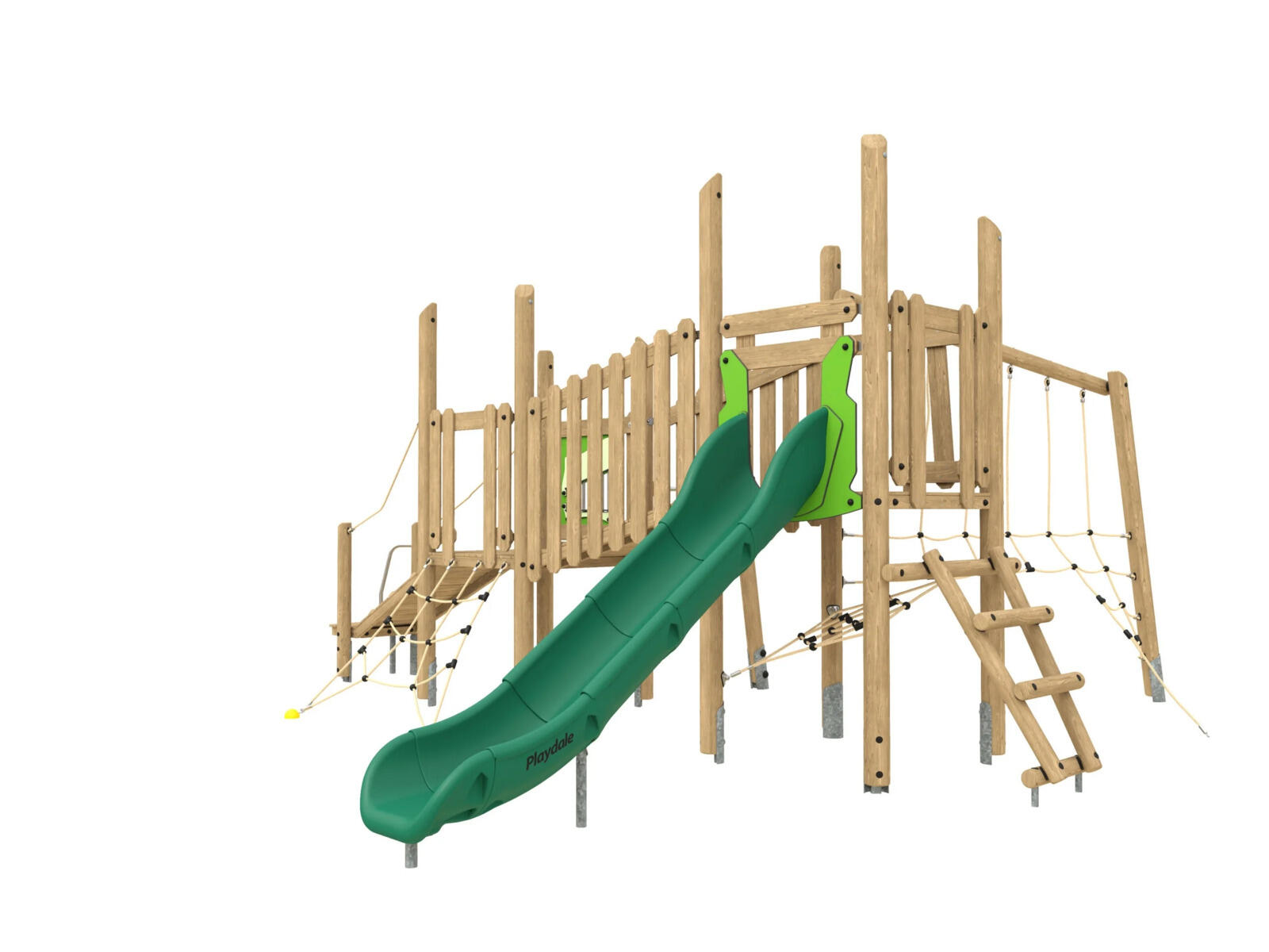 En stor og allsidig konstruksjon som gir barna en komplett lekeopplevelse i harmoni med naturen. Dette multilekapparatet har 4 tårn i ulike høyder, sammenkoblet med flere utfordrende lekeelementer. Her finnes balansebom, tau-bro, klatrevegg, klatrenett, skrå rampe, tau-stige, sklie, stangrutsj og en tunnelrutsj. Det robuste markfestet i stål holder stolpene av limtre over bakken og beskytter mot fukt og slitasje. Tak og sklie i rustfritt stål er tilgjengelig på forespørsel.