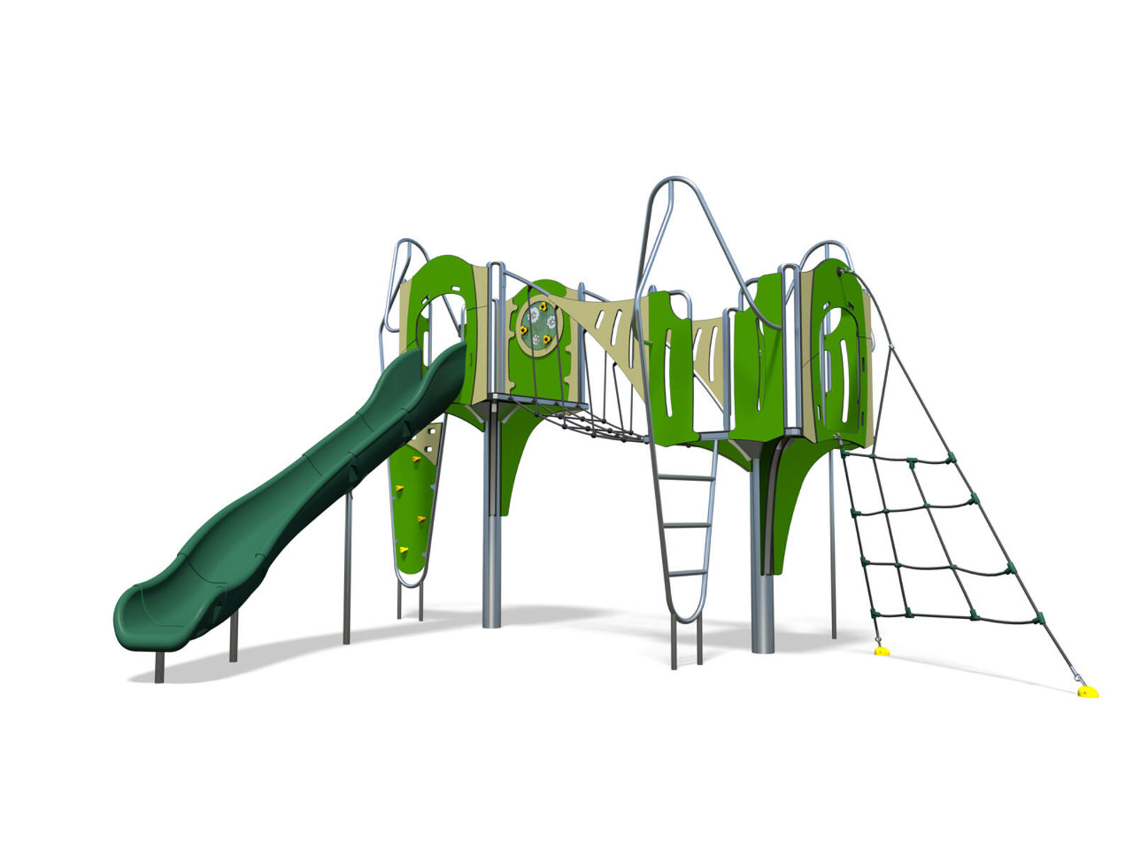 Et utfordrende tårn der barna klatrer opp til plattformen via stige eller et spennende klatrenett for deretter å suse ned sklien i full fart. Det finnes også flere lekpaneler med høyt lekeverdi som utfordrer øye-hånd-koordinasjonen. Produsert i rustfritt stål og slitesterke materialer som krever minimalt vedlikehold. Fargealternativer og sklie i rustfritt stål er tilgjengelig på forespørsel.