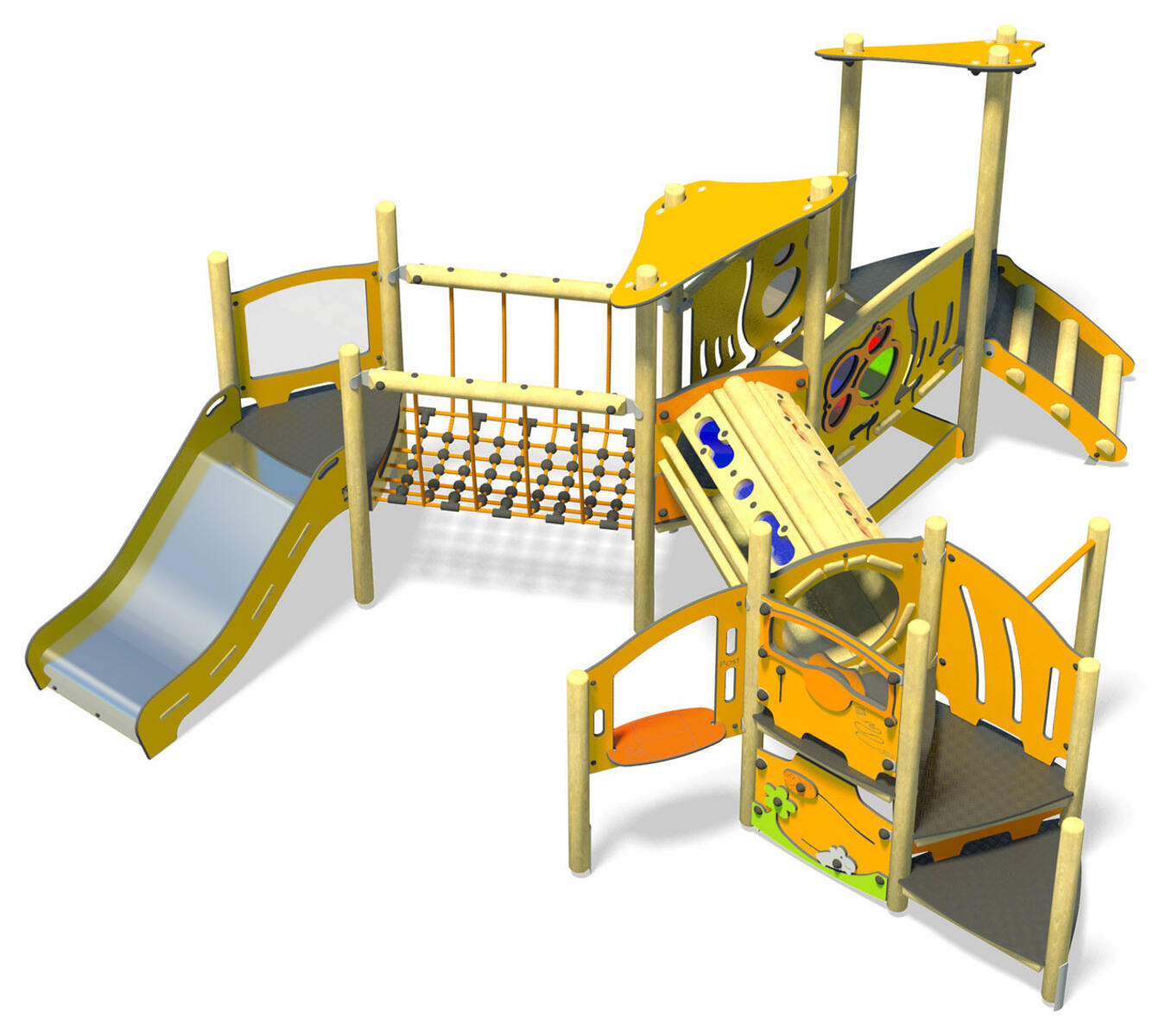 En leken kombinasjon med to tårn der barna klatrer opp via stiger og tau, tar seg over nettbroen og avslutter med en fartfylt sklie. Tegnevinduet inviterer til kreativitet og fantasifull lek. Tilpasset for de yngre barnas motoriske utvikling av balanse og fysisk kapasitet. Laget av limtre, HPL og sklie i stål.