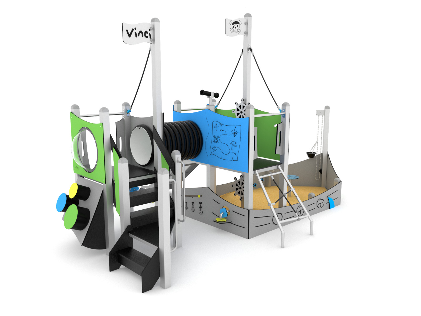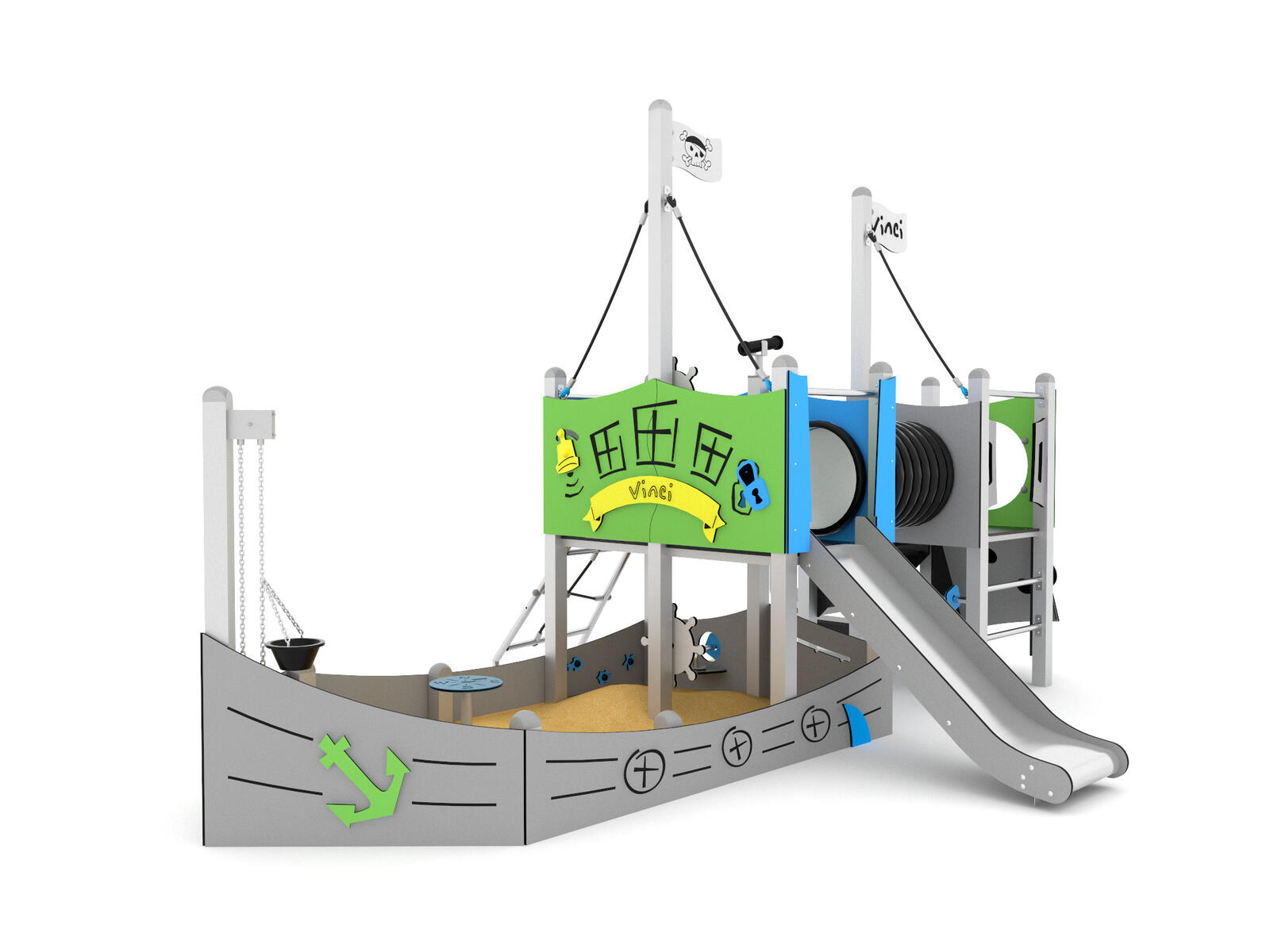 Temalek til lekeplassen. Piratskip med sandkasse, sandheis og bord. 2 plattformer forbundet med tunnel. Trapper, lekepaneler, klatreveggog piratteleskop. Sklie i rustfritt stål med HDPE-sider. Plattformer i HPL. Paneler i HDPE. Sikkerhetssone 498x324 cm, sikkerhetsareal 37,9 m². Fri fallhøyde 90 cm. Alder 4-14 år. Ved montering/installasjon skal alltid manualen som medfølger produktet ved levering benyttes. Den nyeste versjonen er tilgjengelig på forespørsel. Inkluderer markforankring K1.