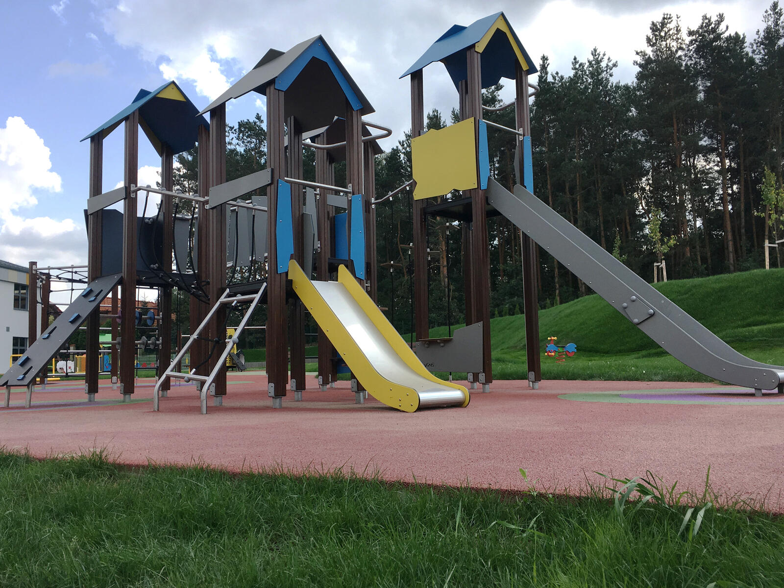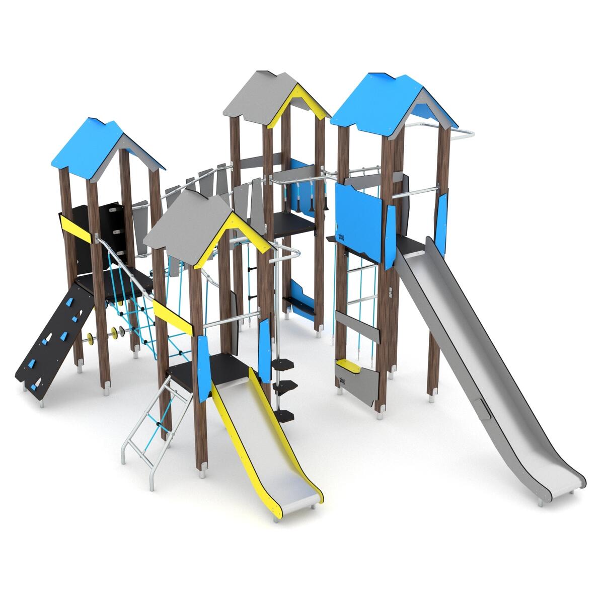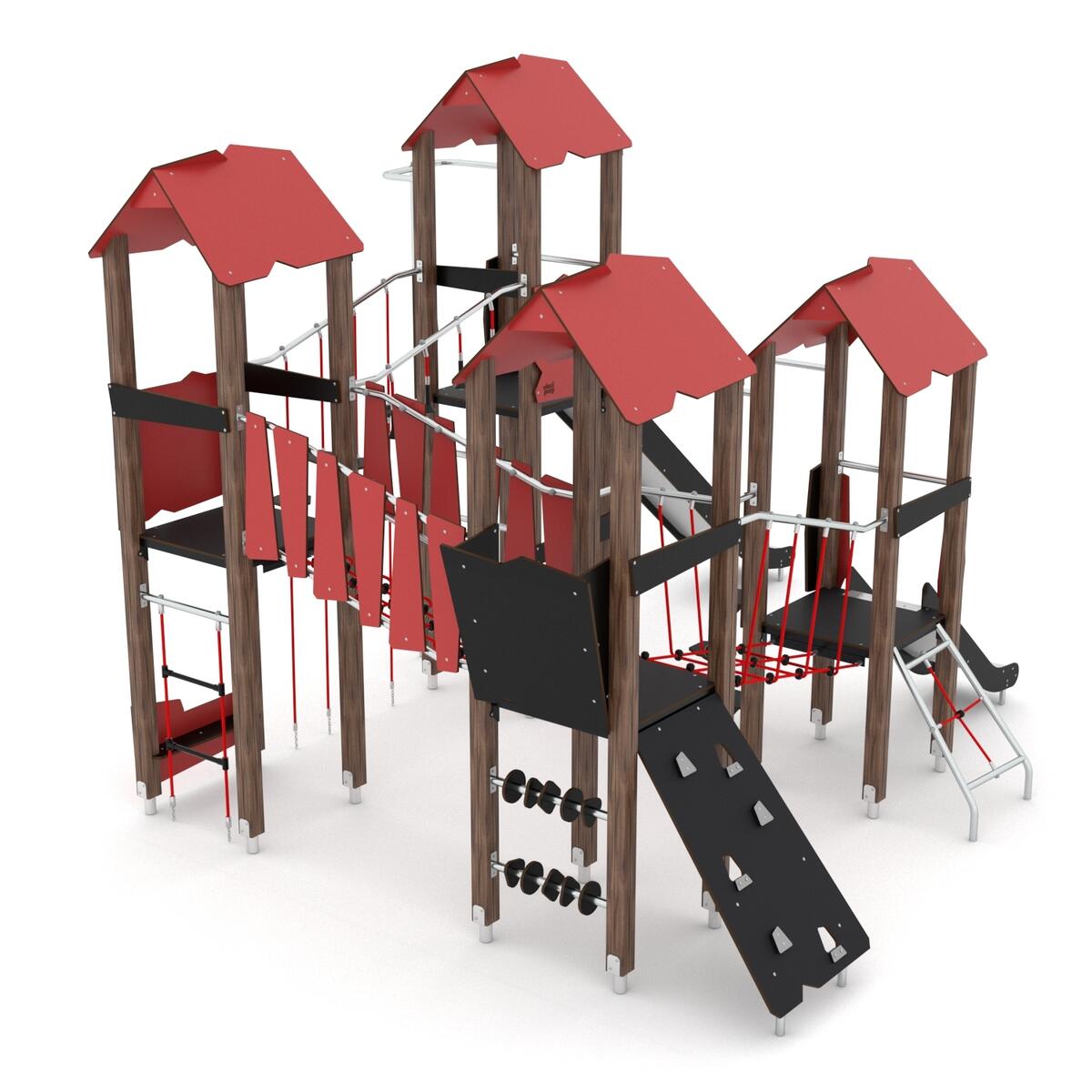 Lekeplass med 4 tårn, sklie, klatrevegg mm. Paneler i HDPE (multifarget) eller HPL (øvrige farger). Ved montering/installasjon skal alltid manualen som medfølger produktet ved levering benyttes. Den nyeste versjonen er tilgjengelig på forespørsel. Inkluderer markforankring K1.