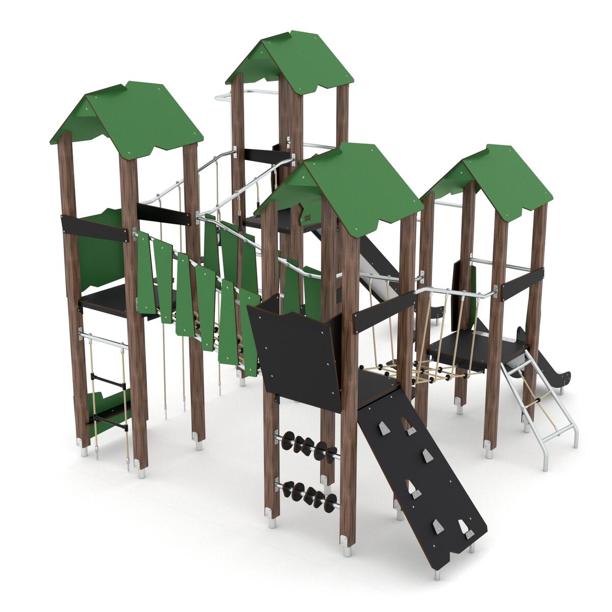 Klatrestativ i tre med bl.a. tårn, broer og klatrevegger. Paneler i HDPE (multifarget) eller HPL (øvrige farger). Ved montering/installasjon skal alltid manualen som medfølger produktet ved levering benyttes. Den nyeste versjonen er tilgjengelig på forespørsel. Inkluderer markforankring K1.