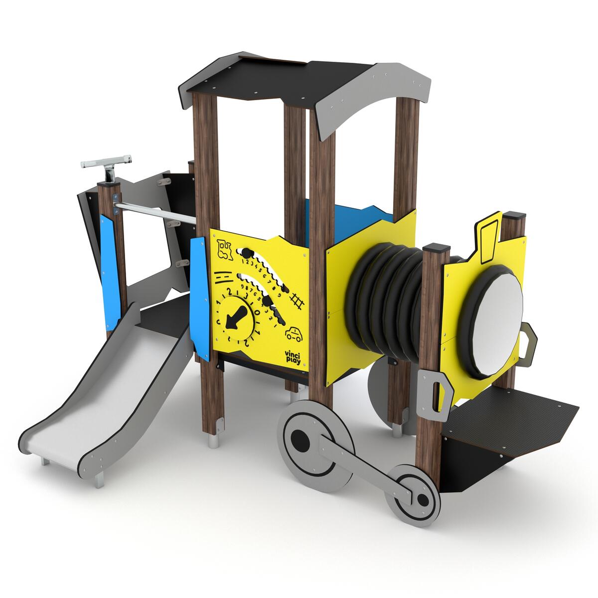 Temalek til lekeplassen. Tog med lekepaneler, teleskop, vindu og sklie i rustfritt stål. Materiale: Impregnert, laminert furu. Plattformer med antiskli og vannfast kryssfiner. Paneler i HDPE flerfarget. Sikkerhetssone 220x292 cm, sikkerhetsareal 24,9 m². Fri fallhøyde 60 cm. Alder 1-8 år. Ved montering/installasjon skal alltid manualen som medfølger produktet ved levering benyttes. Den nyeste versjonen er tilgjengelig på forespørsel. Inkluderer markforankring K1.