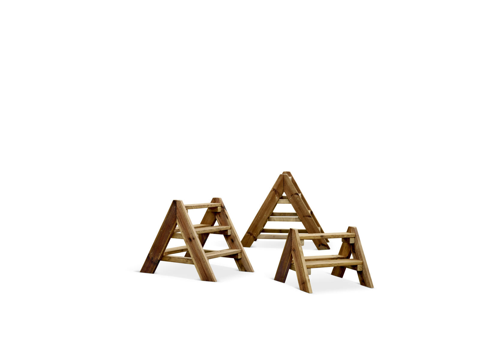 Denne sett med tre allsidige og fleksible bukker oppmuntrer til aktiv lek i utendørsmiljøet. Bukkene er i tre forskjellige høyder og åpne for ulike typer bruk. Lag en hinderløype ved å klatre, balansere eller bruk dem til eventyrlig rollelek. Laget av FSC-sertifisert furu som er antiråtebehandlet. Tas inn når de ikke brukes. Høyden på bukkene er 50 cm, 64 cm og 79 cm. Kjøp gjerne til planke 161298 for å utvide mulighetene til en variert hinderløype.