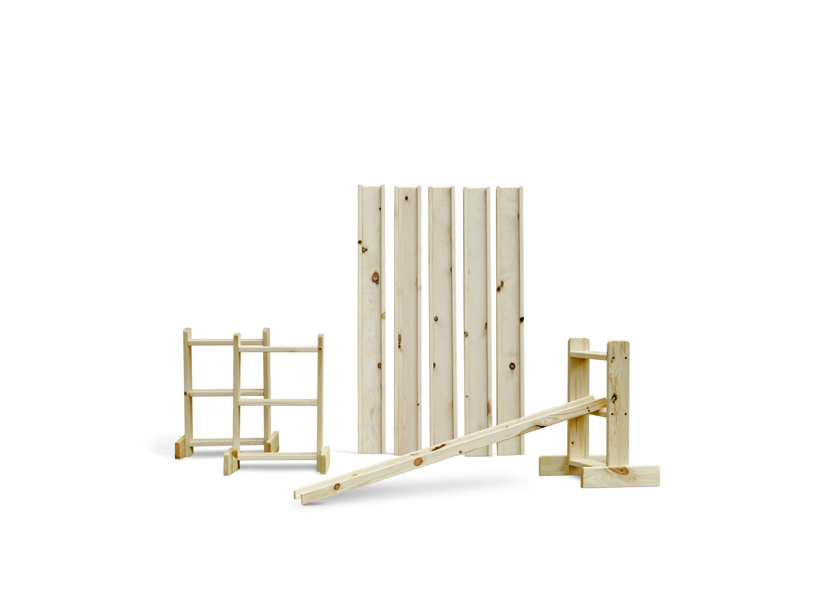 Et allsidig produkt for utendørsmiljøet hvor baner kan forvandles til veier, ramper, kulebaner og mye mer. De 3 stativene har forskjellige høydeinndelinger, noe som gjør det mulig å eksperimentere med ulike hellinger på banene for sammenligning og utforskning. Gjennom praktisk lek kan barna få en grunnleggende forståelse av gravitasjon, bevegelse og teknikk. Dette produktet er perfekt for å vekke nysgjerrighet rundt årsak og virkning samt for å trene problemløsningsferdighetene. Både baner og stativer er lette nok til at barna kan bære og justere dem, noe som legger til rette for selvstendig utforskning. Settet inneholder 6 baner og 3 stativer. Laget av FSC-sertifisert furu som er behandlet med linolje. Tas inn når det ikke brukes.