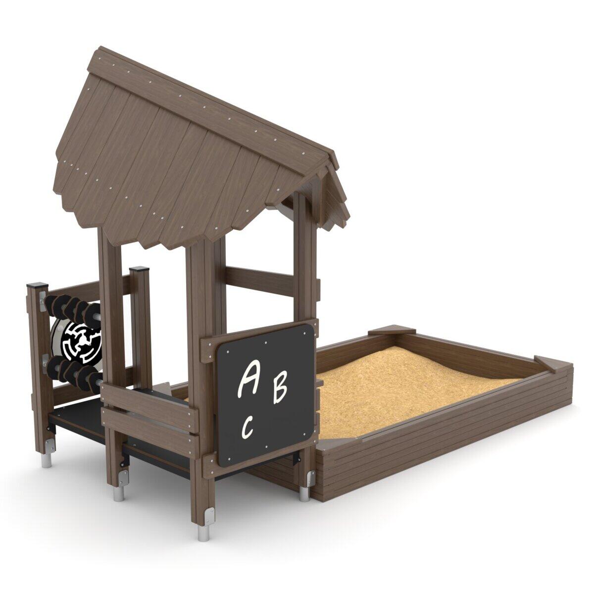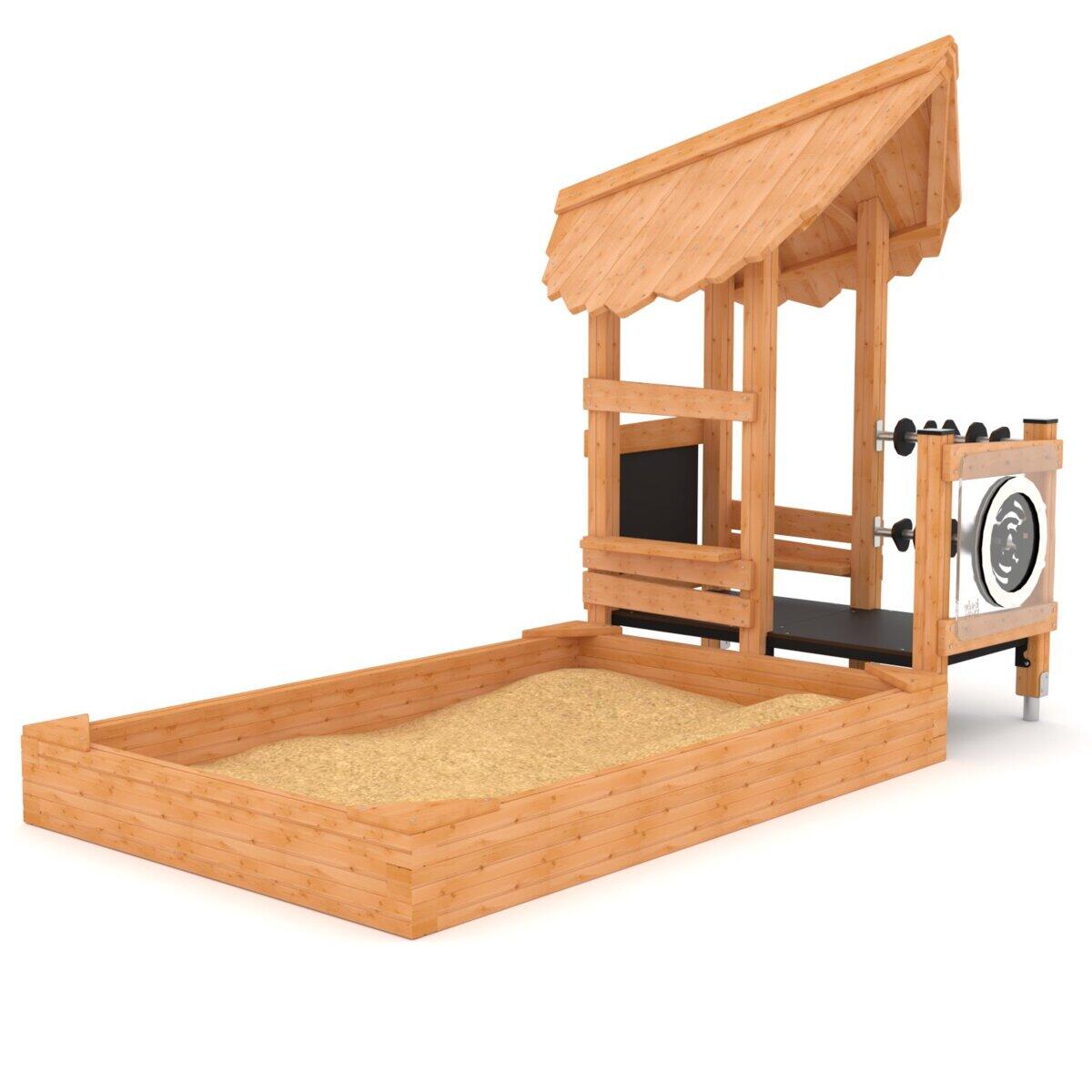 Med sitt naturlige inntrykk blir sandkassen et selvfølgelig og morsomt tilskudd til utemiljøet. Den tilbyr barna et sted å skape sin egen fantasiverden med sand, noe som fremmer både deres kreativitet, kommunikasjonsevne og koordinasjon. Den brede kanten rundt sandkassen fungerer både som en naturlig lekeplass og en komfortabel sitteplass rundt sandkassen. Sandkassen er delt inn i 3 forskjellige nivåer. Laget av FSC-sertifisert Robinia, et treslag med høy motstandskraft mot værpåvirkning. Det har evnen til å absorbere minimalt med vann og utmerker seg gjennom sin ekstremt lange holdbarhet. Monteres i henhold til installasjonsmanualen