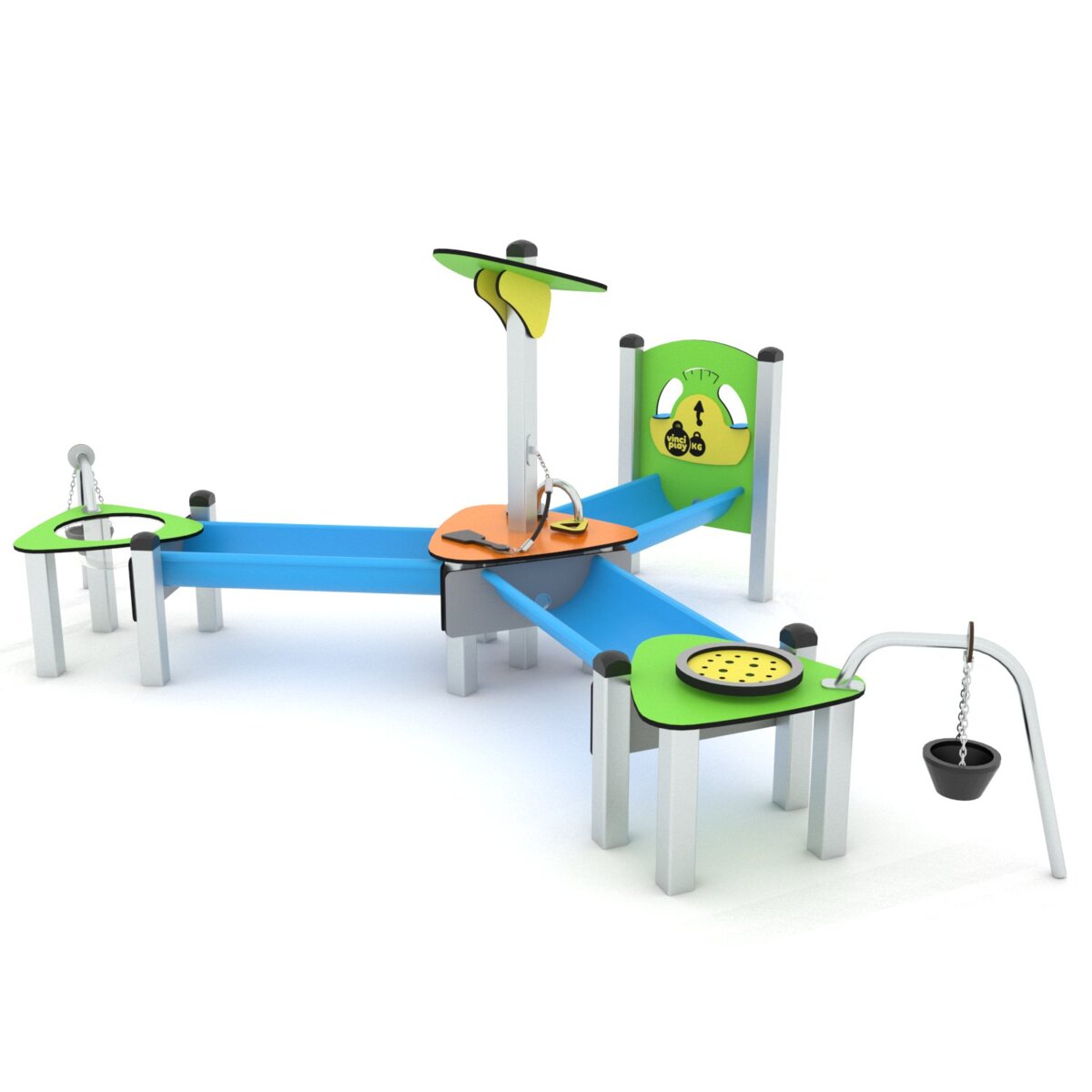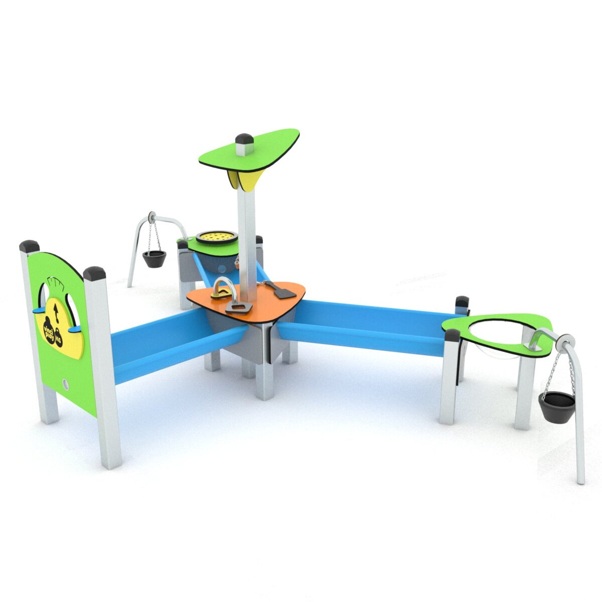 Denne store kombinasjonen passer veldig godt for flere barn å leke sammen med både vann og sand. Vannlek blir satt pris på, underholder og stimulerer de fleste barn i det uendelige. La barna utforske vannets egenskaper i de 3 renner og sammen med sanden bake gode og klissete sandkaker. Her får barna mulighet til å veie, øse og heise sanden opp og ned i kurven. Konstruksjonen er tilpasset i høyde for de yngste barna og gir en sikker lekeplassmiljø. Stålkonstruksjon med HDPE-paneler. Monteres i henhold til installasjonsmanualen. Ved montering/installasjon skal alltid manualen som medfølger produktet ved levering benyttes. Den nyeste versjonen er tilgjengelig på forespørsel.