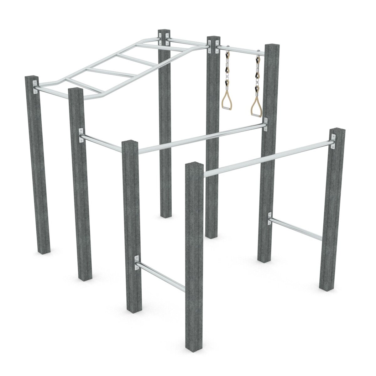 Skap et inspirerende utemiljø som både utfordrer og motiverer. Et solid treningsutstyr som gir mulighet til å trene allsidig, effektivt og funksjonelt utendørs. Denne allsidige kombinasjonen har både pull-up stang, parallell stang og en horisontal stige for dobbel armgang. Denne konstruksjonen er basert på resirkulert materiale. Alle stolper er laget av resirkulert tekstil. Noen av mange fordeler med dette materialet er at det ikke ruster, ikke absorberer vann, er UV-resistent og likevel er like holdbart som stål. Stålkonstruksjonen er laget av galvanisert og pulverlakkert stål. Monteres i henhold til installasjonsmanualen. Ved montering/installasjon skal alltid manualen som medfølger produktet ved levering benyttes. Den nyeste versjonen er tilgjengelig på forespørsel.