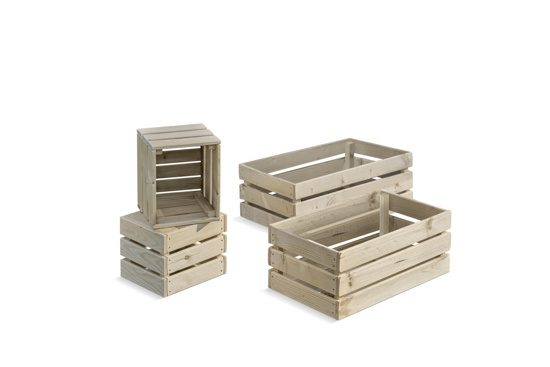 Et sett med fire funksjonelle oppbevaringskasser som bidrar til å skape orden og struktur i barnehagens utemiljø. Perfekte for å organisere lekematerialer og naturmaterialer, samtidig som de gjør det enkelt for barna å hente frem og rydde bort selv. Laget av FSC-sertifisert furu med oljet overflate. Leveres ferdig montert. Settet inneholder fire kasser med målene: 2 stk 31×25×24 cm, 1 stk 60×35×24 cm og 1 stk 69×39×24 cm.