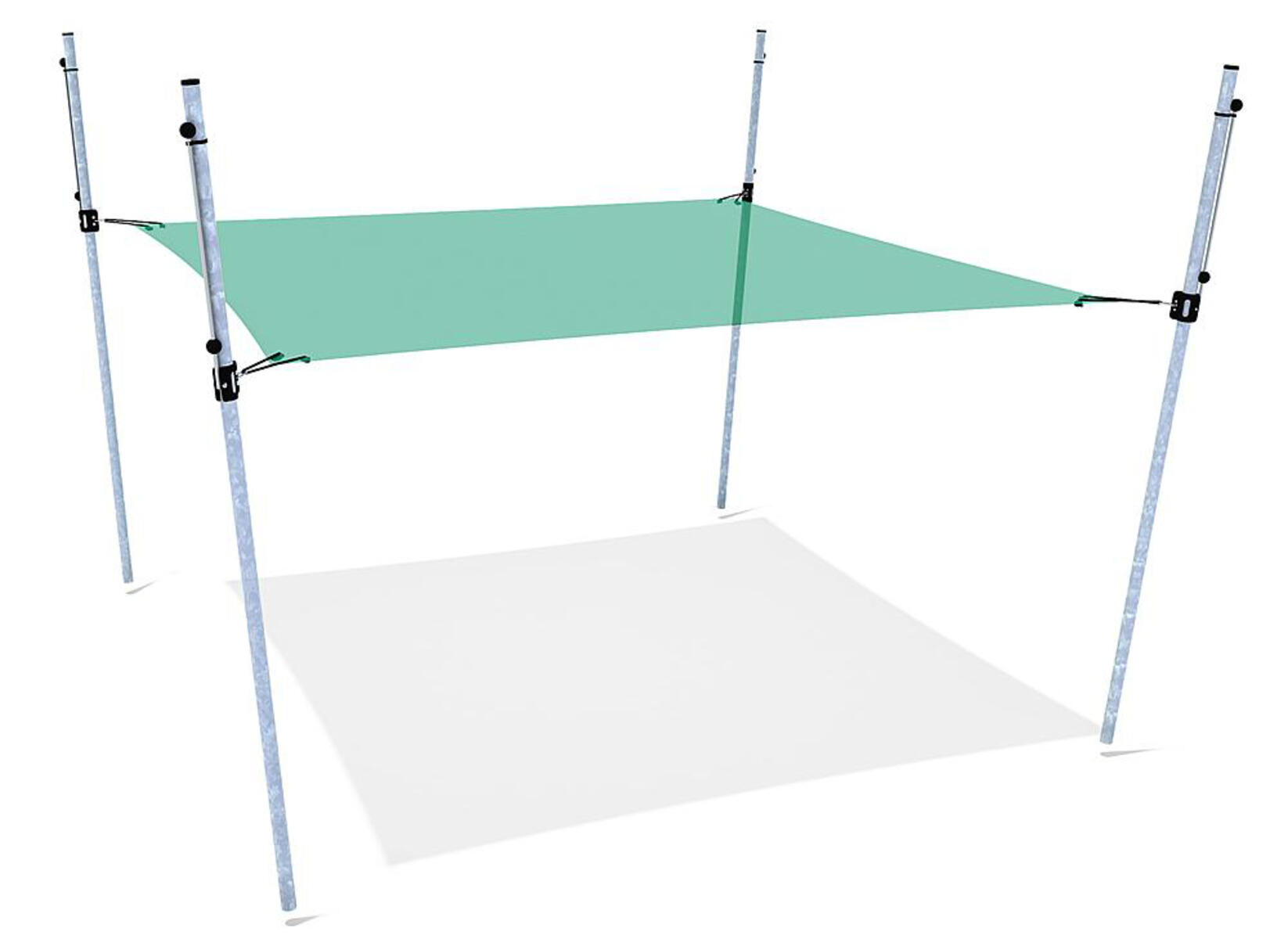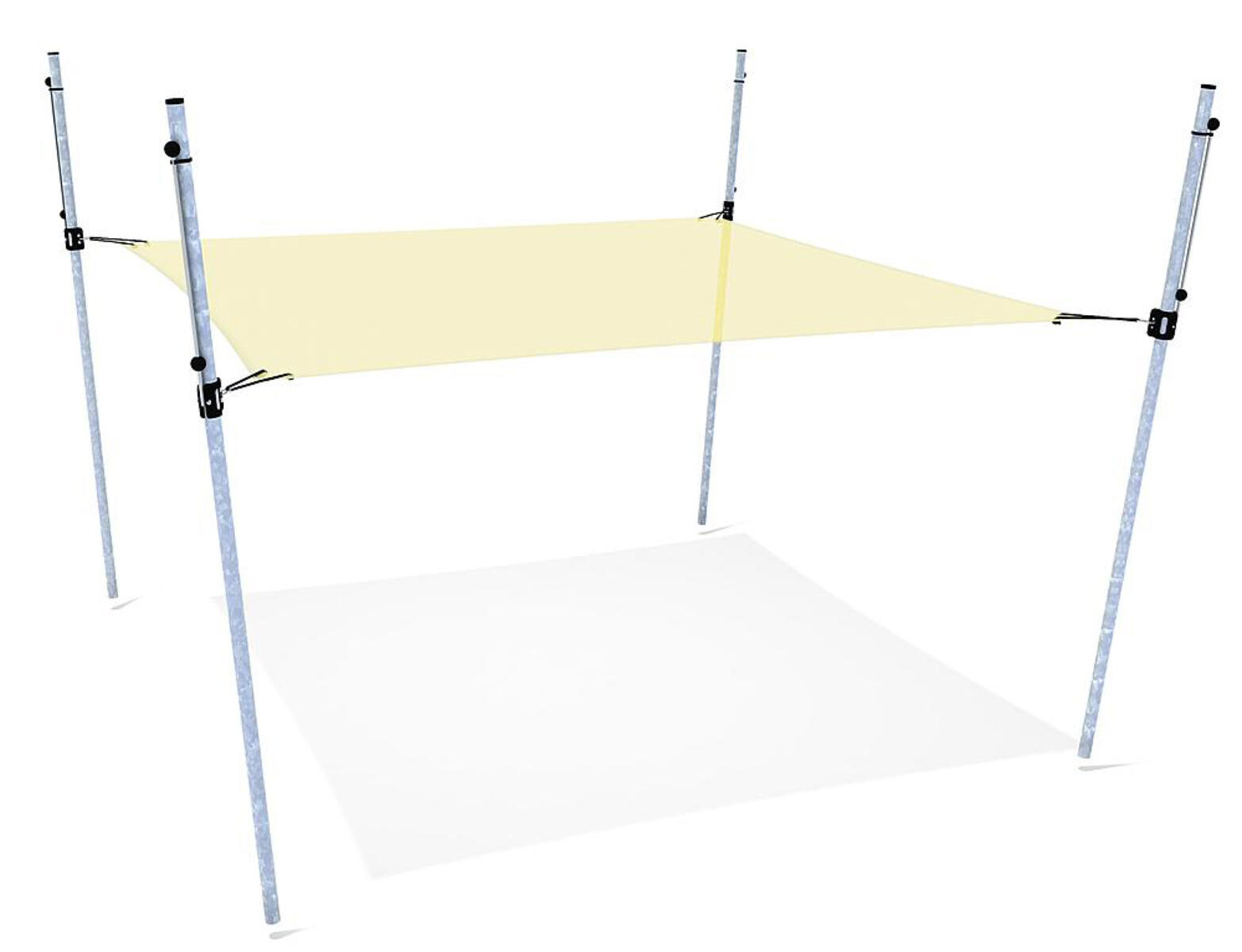Firkantet solseil i HDPE 4x4 m. Inklusiv stålstolper og beslag. Solseil i HDPE, et materiale med stor styrke. UV behandlet, slik at opp til 90% av solens farlige stråler ikke trenger gjennom. En viss vanngjennomtrengning tillates, slik at det ikke blir liggende vann på seilet. Dette bidrar til at soleilet varer lenger.