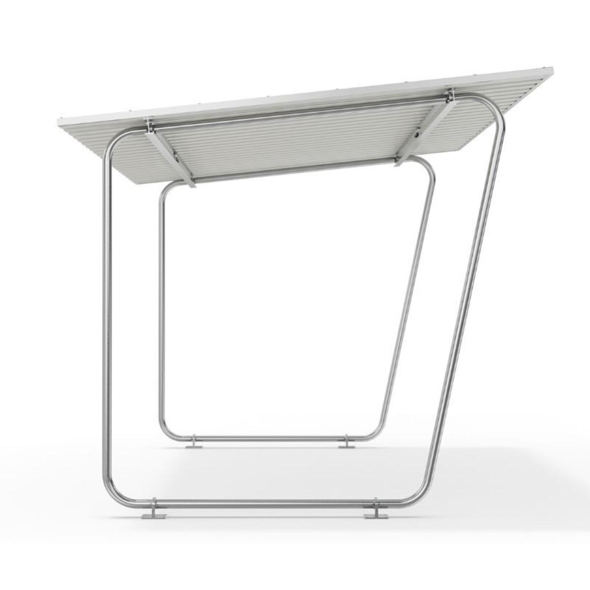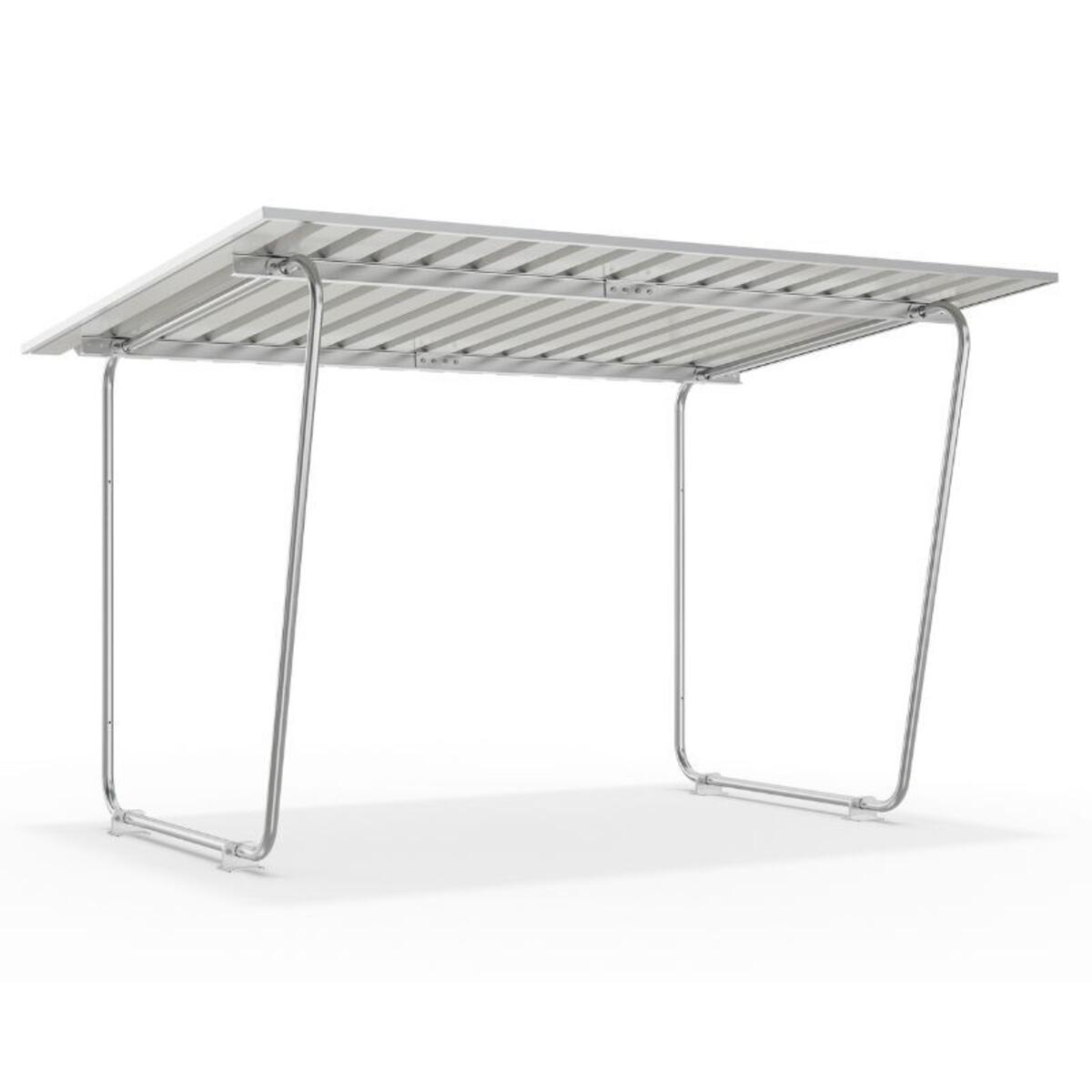 Kraftig dobbelt sykkelskjul med skrått tak i metall. Ramme av galvanisert stål.