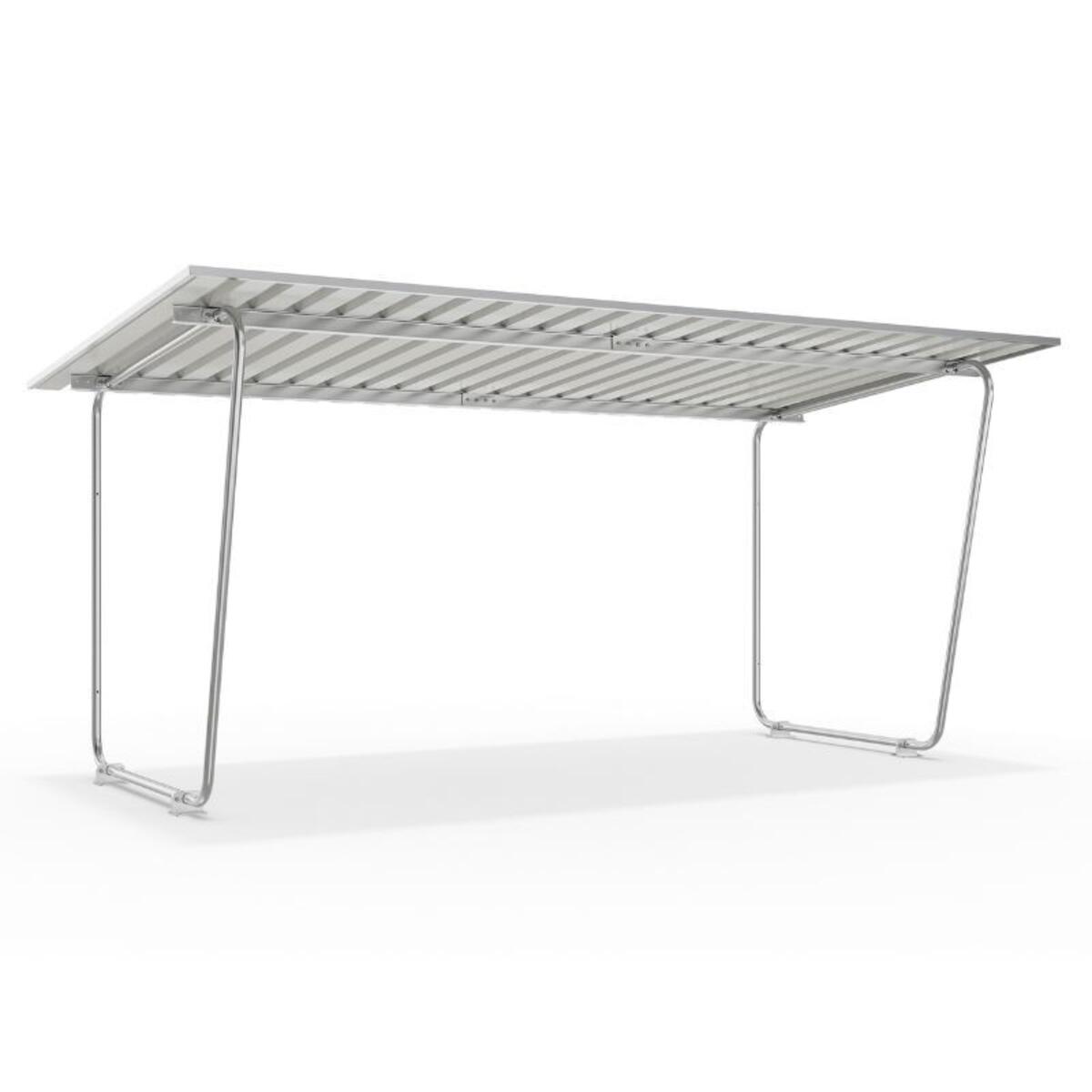 Kraftig dobbelt sykkelskjul med skrått tak i metall. Ramme av galvanisert stål.