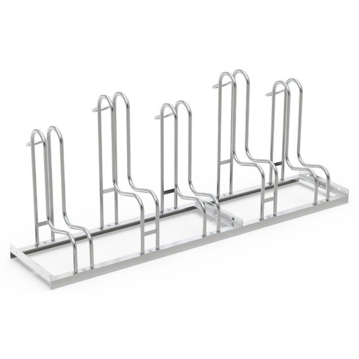 Sykkelstativ for 5 sykler. Passer for dekkbredde opp til 64 mm. Produsert i galvanisert stål.