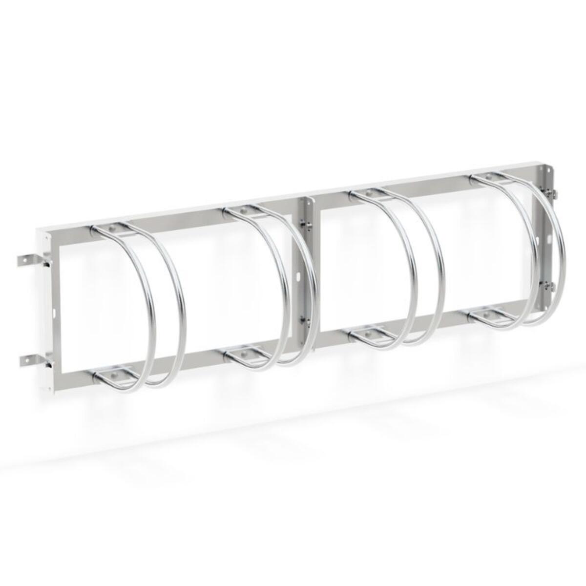 Vegghengt sykkelstativ for 6 sykler. Passer for dekkbredde opp til 55 mm. Produsert i galvanisert stål.