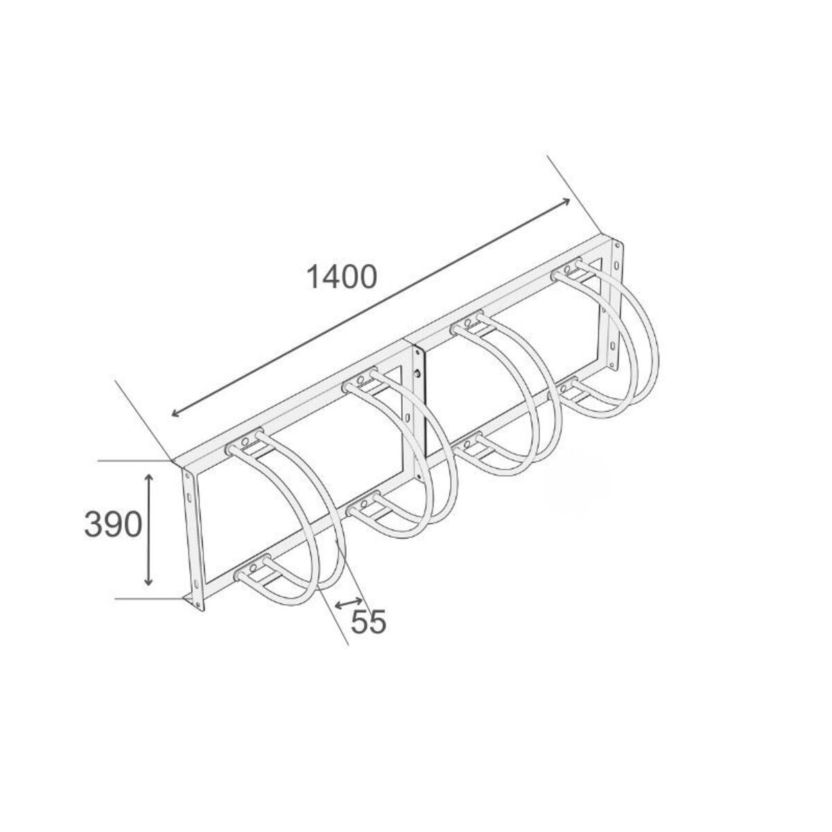 Vegghengt sykkelstativ for 4 sykler. Passer for dekkbredde opp til 55 mm. Produsert i galvanisert stål.