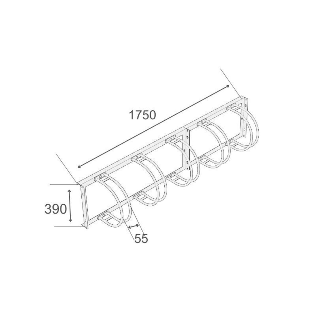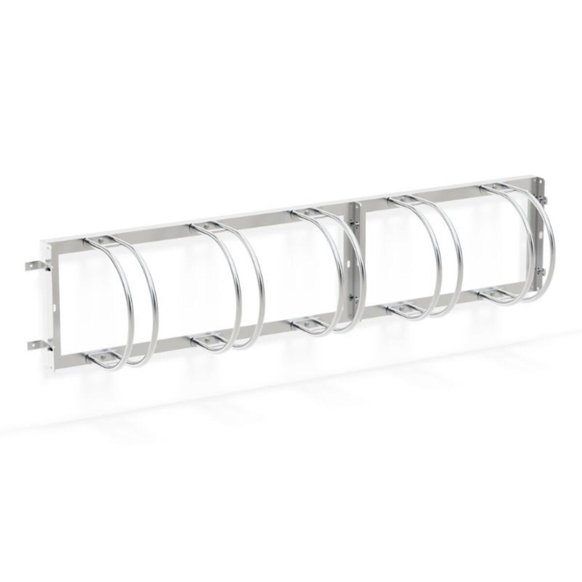Vegghengt sykkelstativ for 5 sykler. Passer for dekkbredde opp til 55 mm. Produsert i galvanisert stål.