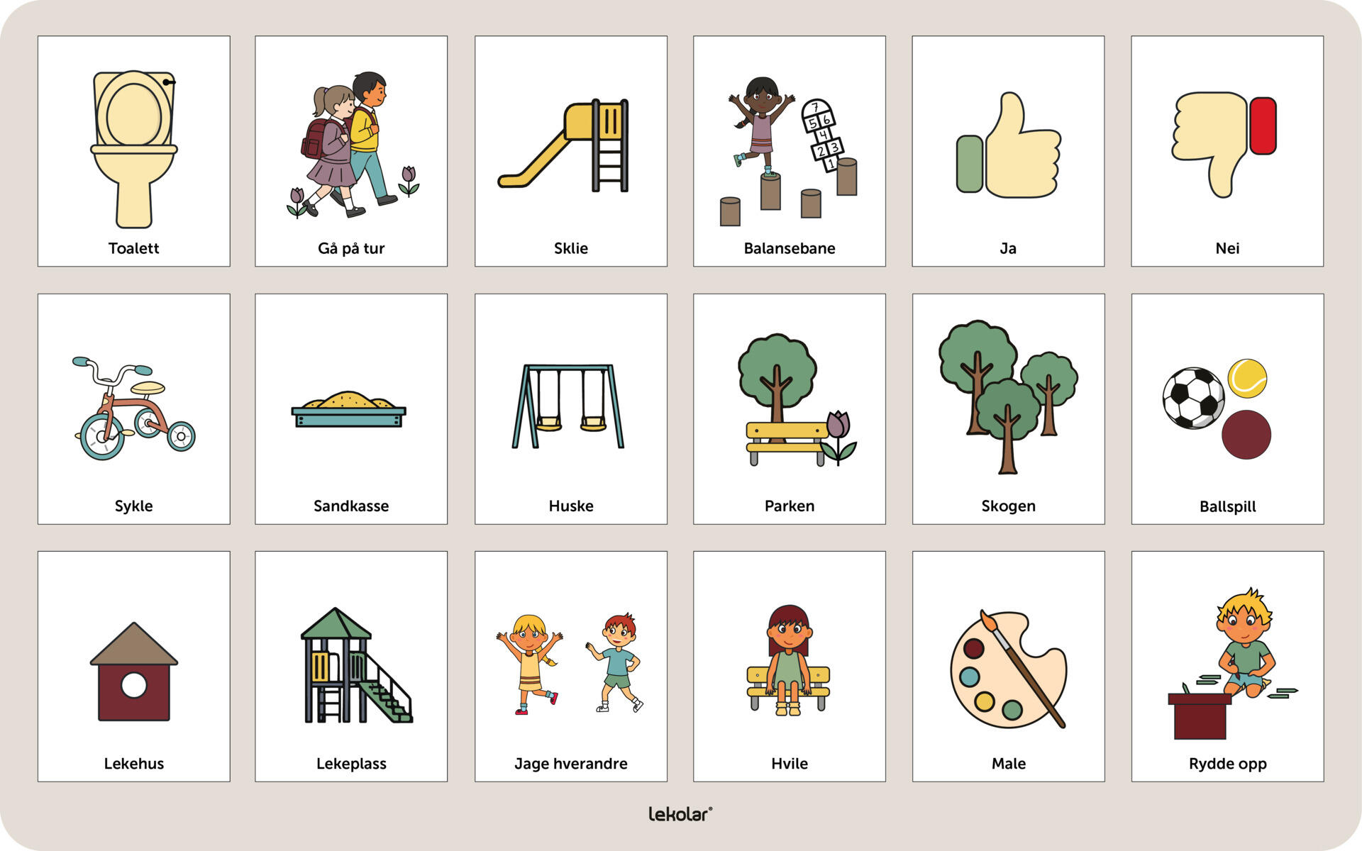 Vårt utendørsskilt er utviklet for å styrke inkluderingen i utemiljøet. Skiltet støtter barna i å tydeliggjøre situasjoner, behov og aktiviteter gjennom klare og lett forståelige symboler. Bildestøtten gjør kommunikasjonen enklere, reduserer usikkerhet og gir barna mulighet til å uttrykke behov og følelser, også i miljøer der dette ellers kan være vanskelig.