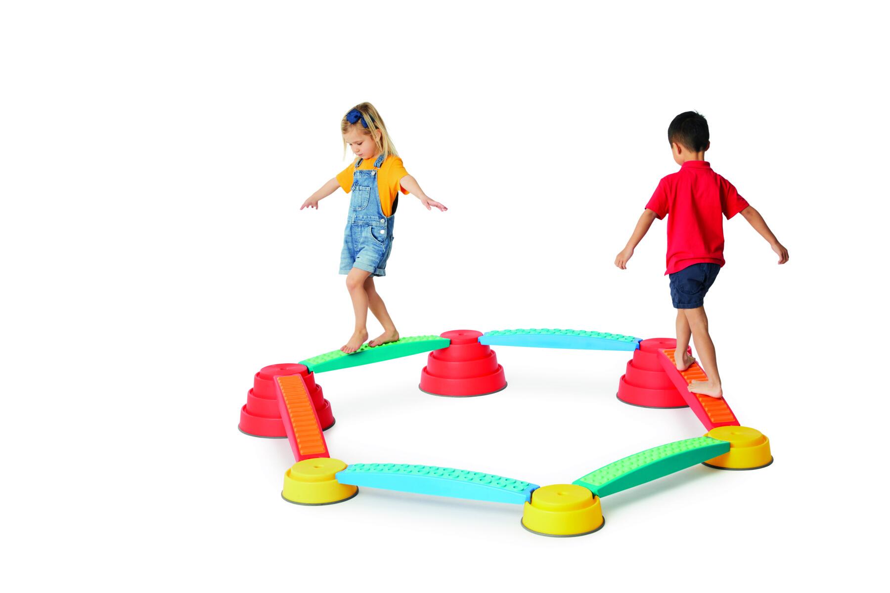 6 steiner og 6 stokker som er koblet sammen med tau som kan justeres. Hver stein og stokk har "antiskli" for å ligge stabilt. Avstanden mellom stokkene og steinene kan justeres slik at barna kan utvikle balanse ved å øke avstanden mellom dem. Tåler maks vekt på 100 kg. Mål på stein: topp Ø23 cm, bunn Ø32 cm, høyde 13 cm. Mål på stokk: Lengde 50 cm, bredde 14 cm. Av polyårpen. Fra 3 år.