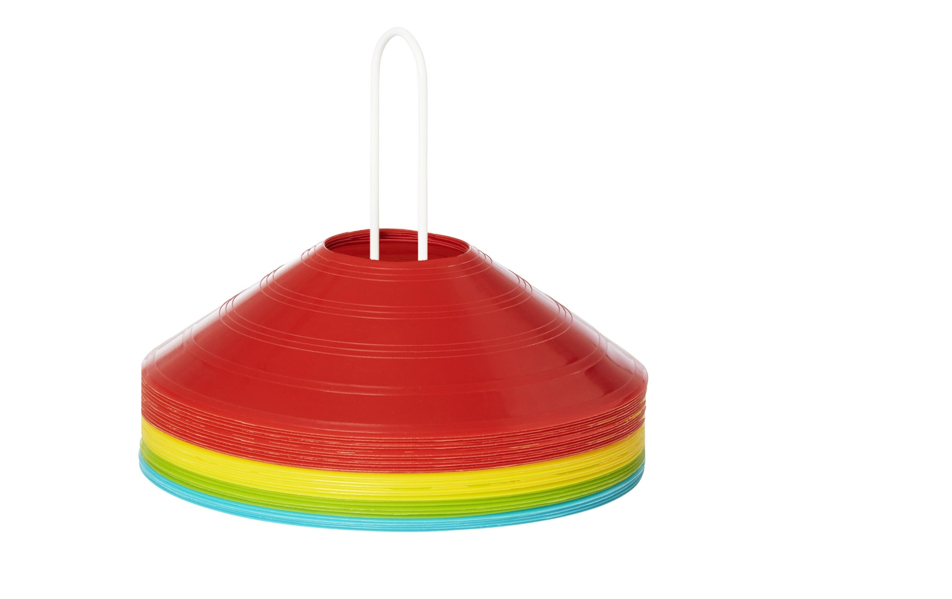 Et sett med 15 røde kjegler, 15 gule, 10 grønne og 10 blå kjegler for bruk både inne og ute. Stativ medfølger for enklere oppbevaring. Høyde på kjegle: 5 cm. Høyde på stativ: 20 cm. PVC-fritt. Laget av metall og PE (polyetylen).