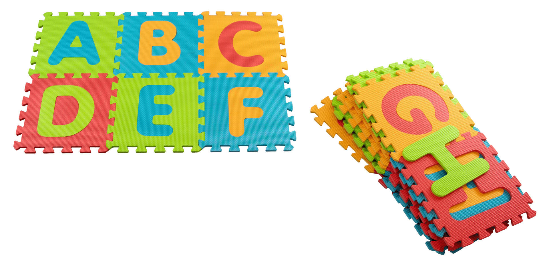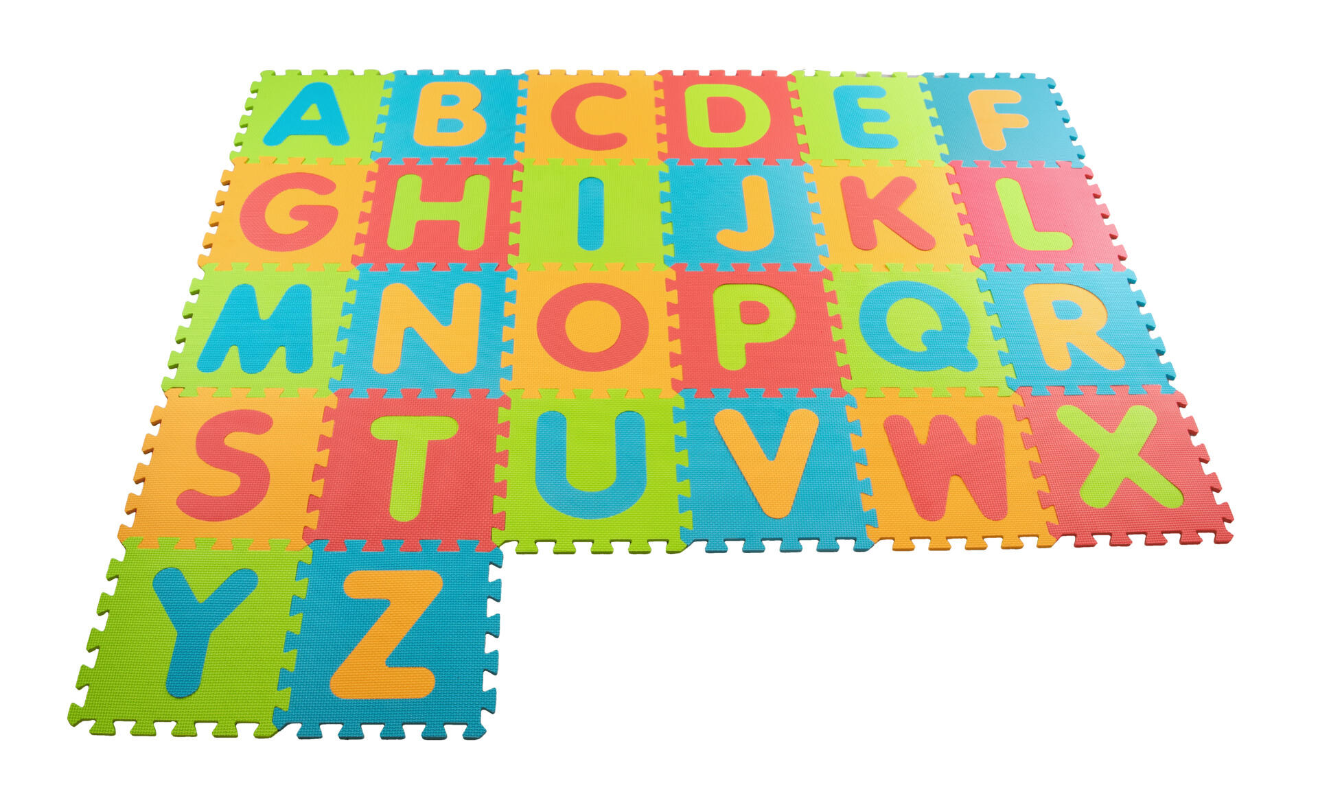 26 brikker. En støydempende lekematte som kan brukes både som puslespill og underlag ved lek på gulvet. Innebygde bokstaver som også fungerer som puslespillbrikker. Mål: 32×32×1 cm. Laget av EVA. PVC-fri. Fra 1 år.