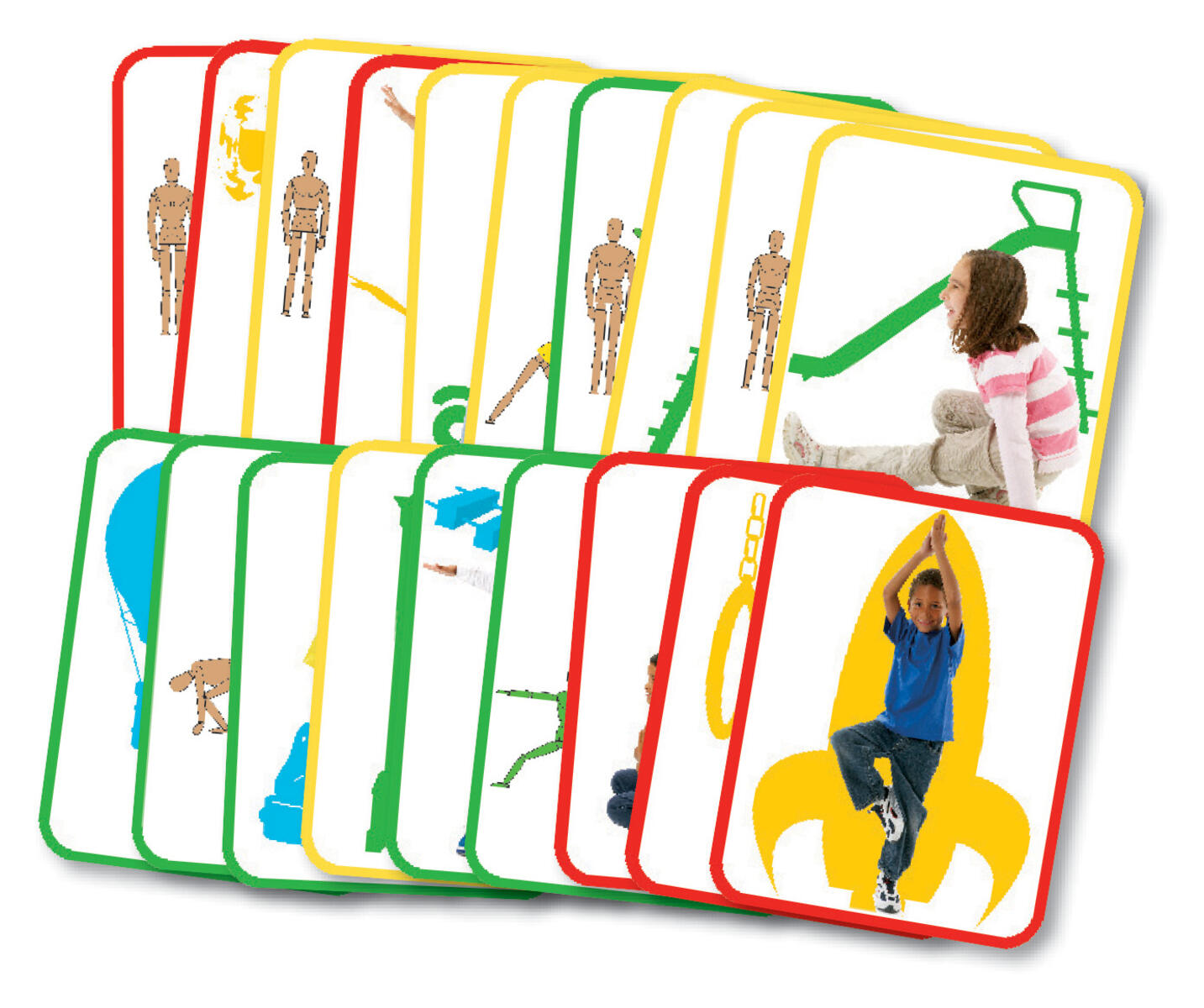 16 kort med bevegelser som fremmer motorikk. Hopp, strekk, bøy og klatre – alle bevegelsene du trenger. Grønne kort er enkle og røde kort litt vanskeligere. Perfekt trening å gjøre i klasserommet. Mål: 28x21 cm. Laget av papp.Fra 3 år.