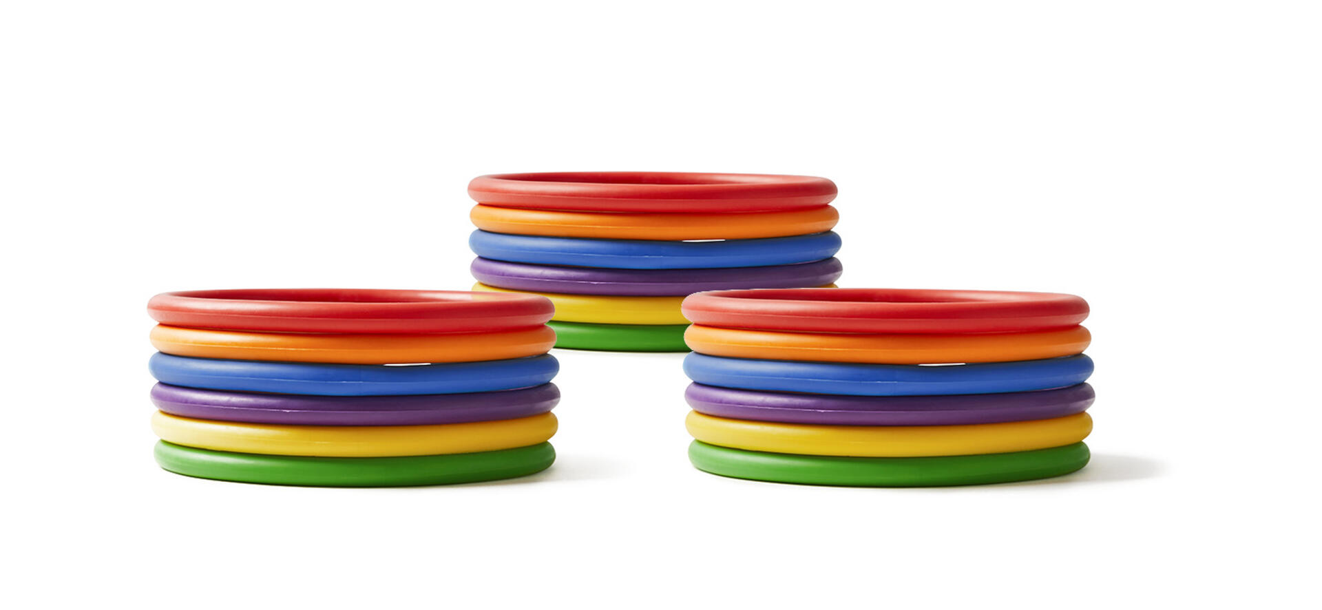 6 stk/sett. Fargerike og tiltalende ringer av gummi med uendelige bruksområder f eks sjonglering, kaste- og fange øvelser, dans, regneøvelser mm. Passer både til individuell lek og lek i grupper. Mål: Ø16,4 cm.