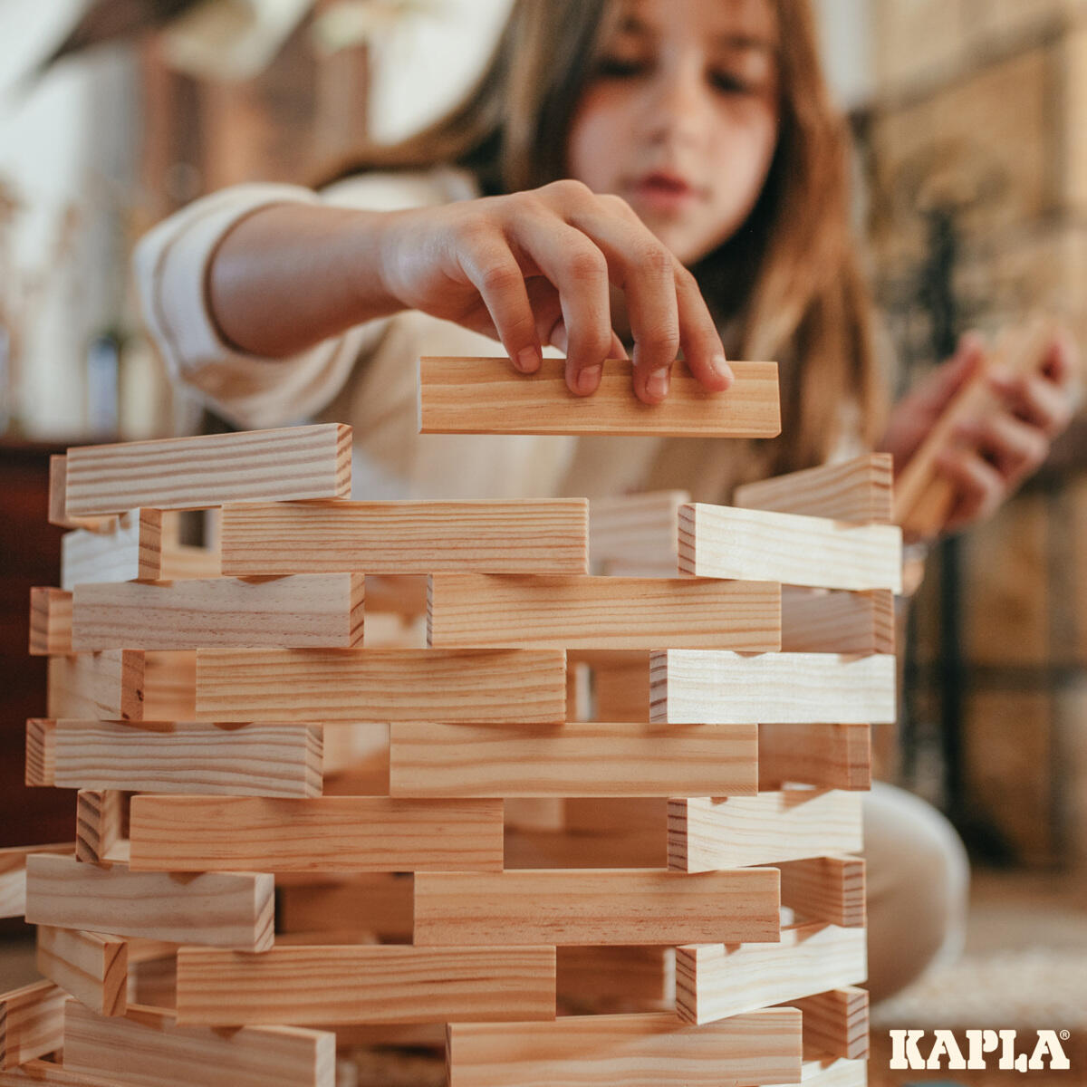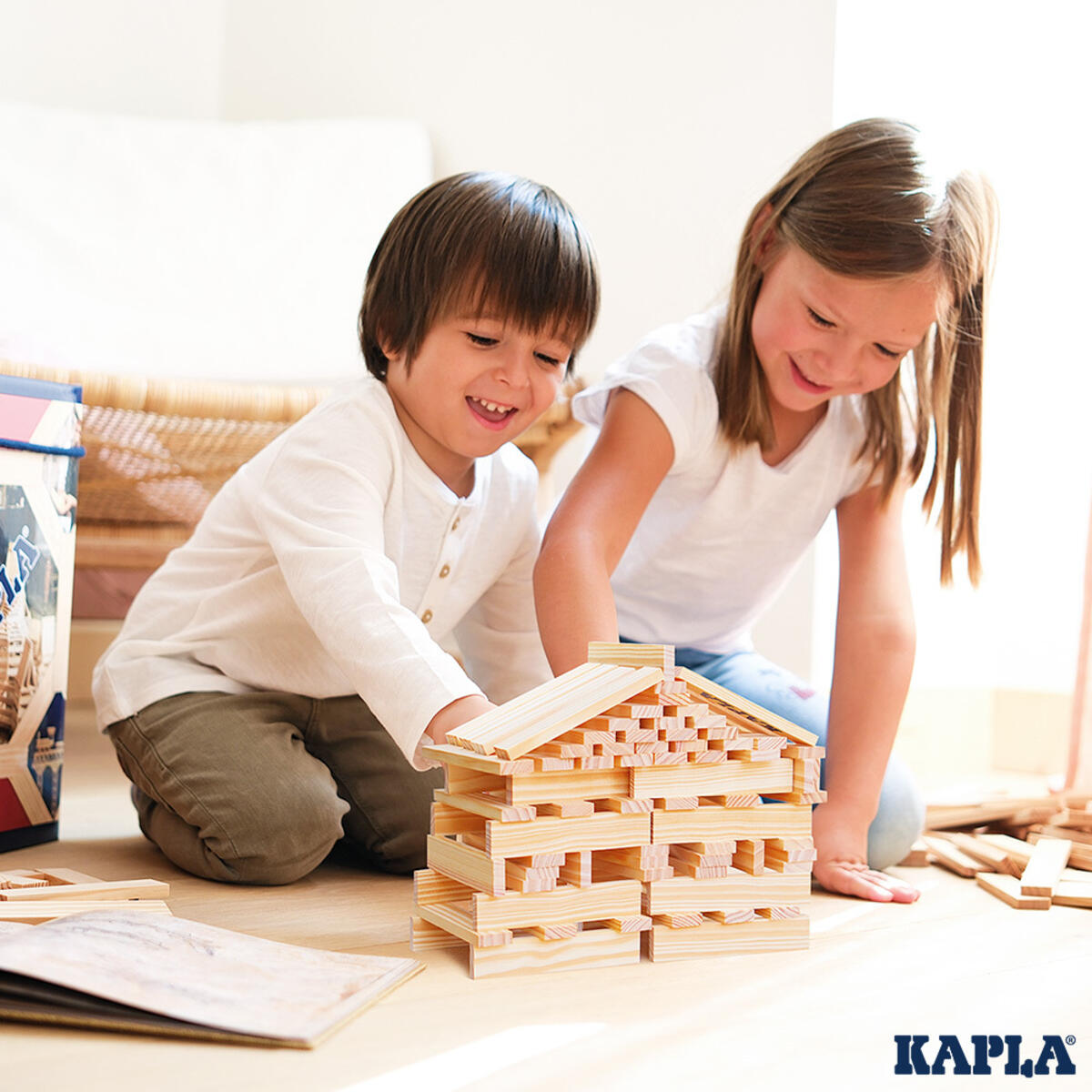 Alle byggestavene er identiske. Holder til mange timers kreativ konstruksjon. Lengde 12 cm. 2 byggeveiledninger. Fra 3 år. Leveres i treboks med lokk og hjul. Av PEFC-merket bjørk.