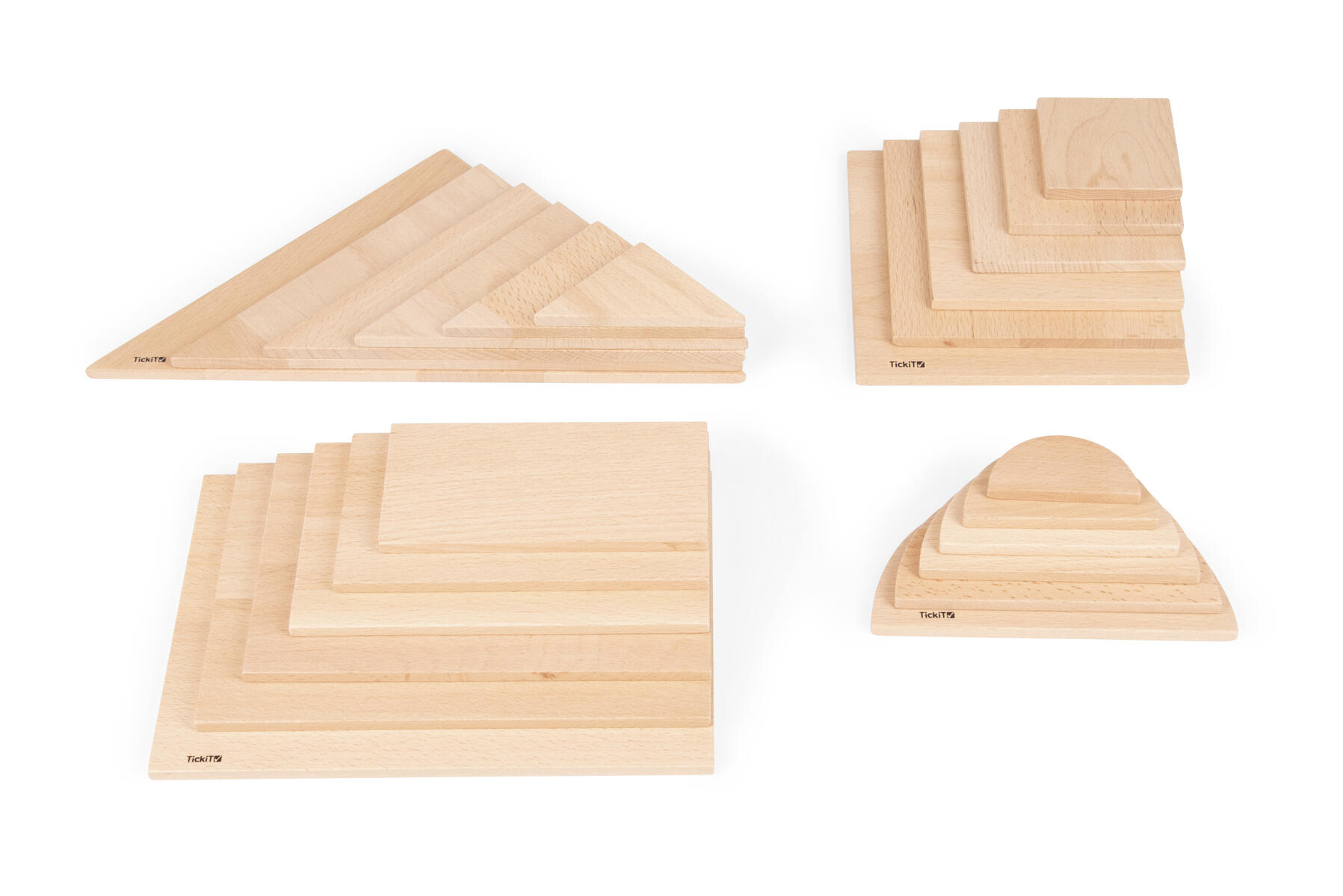 Naturlige paneler i fire former som utvider regnbuens arkitektursett. Bygg lenger og bredere, eller legg lokk og baser til formene for sortering og gruppering. Av bøk. Fra 1 år.