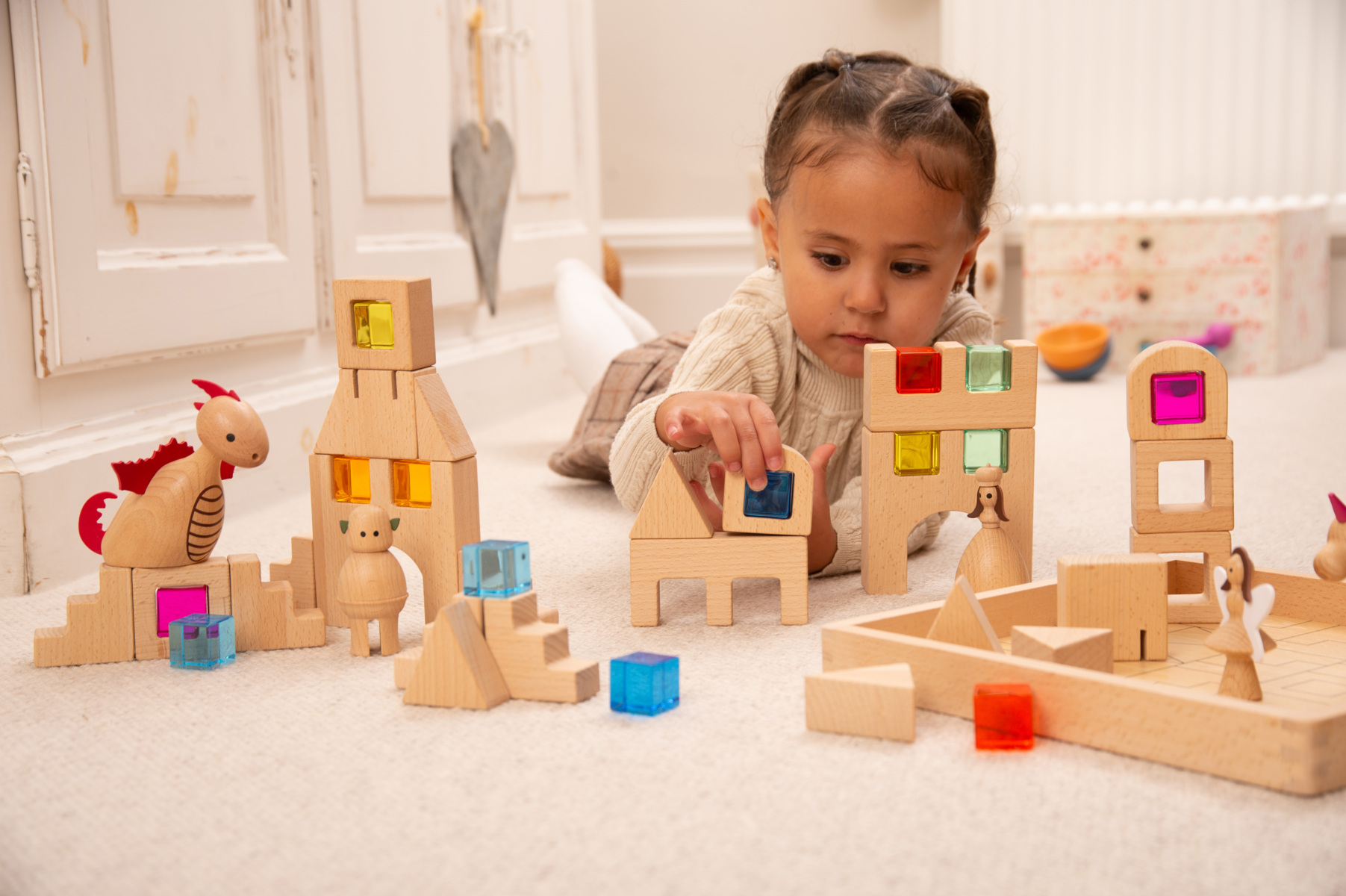 Fine treklosser med fargede transparente innsatser. Ved å kombinere klossene på ulike måter får barna lage og oppleve forandringer i farger. Man kan bygge, stable, sortere og navngi de geometriske formene. Av FCS-merket kryssfiner. Mål: 28x28 cm. Fra 2 år.