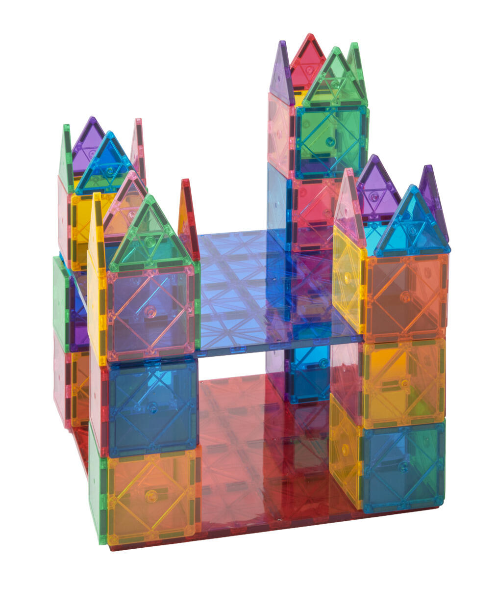 Magna-Tiles er store magnetiske byggeklosser, som er morsomme å bygge med. Store og små, tre- og firkantede, transparente, fargede plater med magnet som drar seg til hverandre når barna bygger. 100 deler hvorav tre ulike trekanter og to ulike kvadratiske former. Av ABS-plast. Mål på kvadrat: 7,5x7,5 cm og 15x15 cm. Fra 3 år.