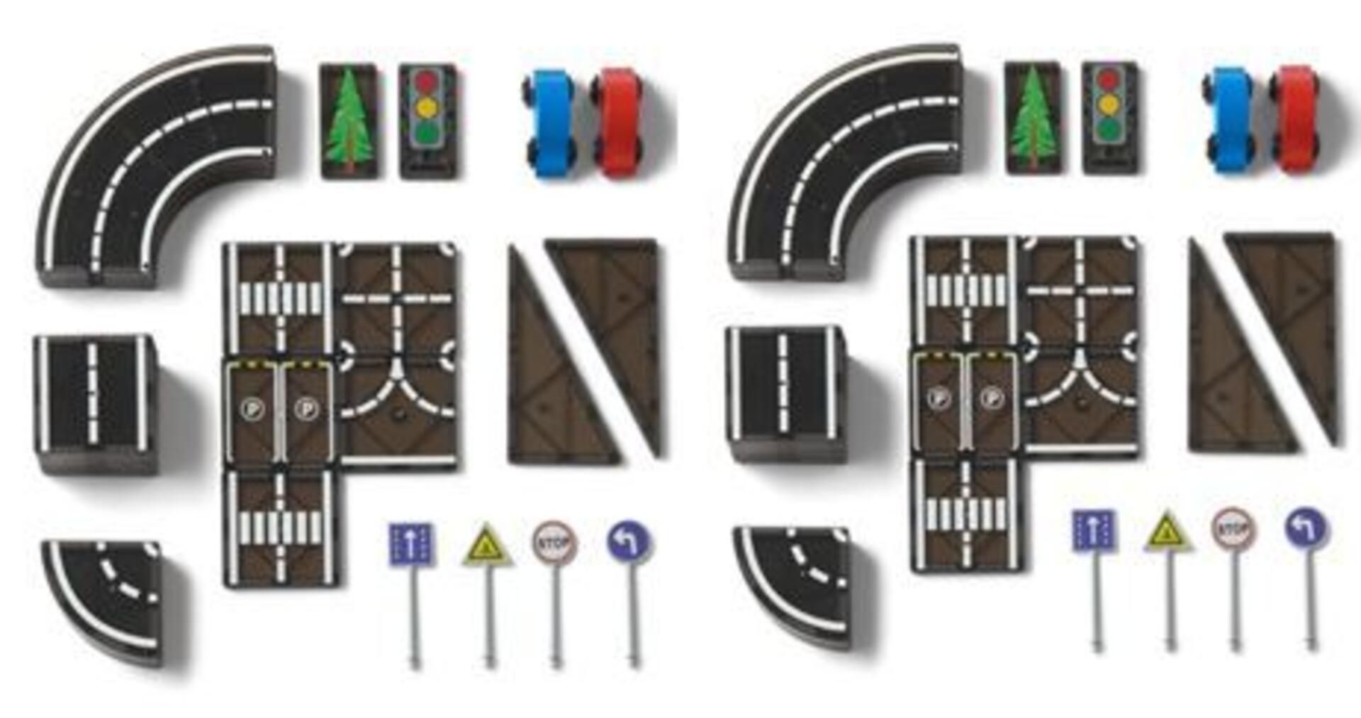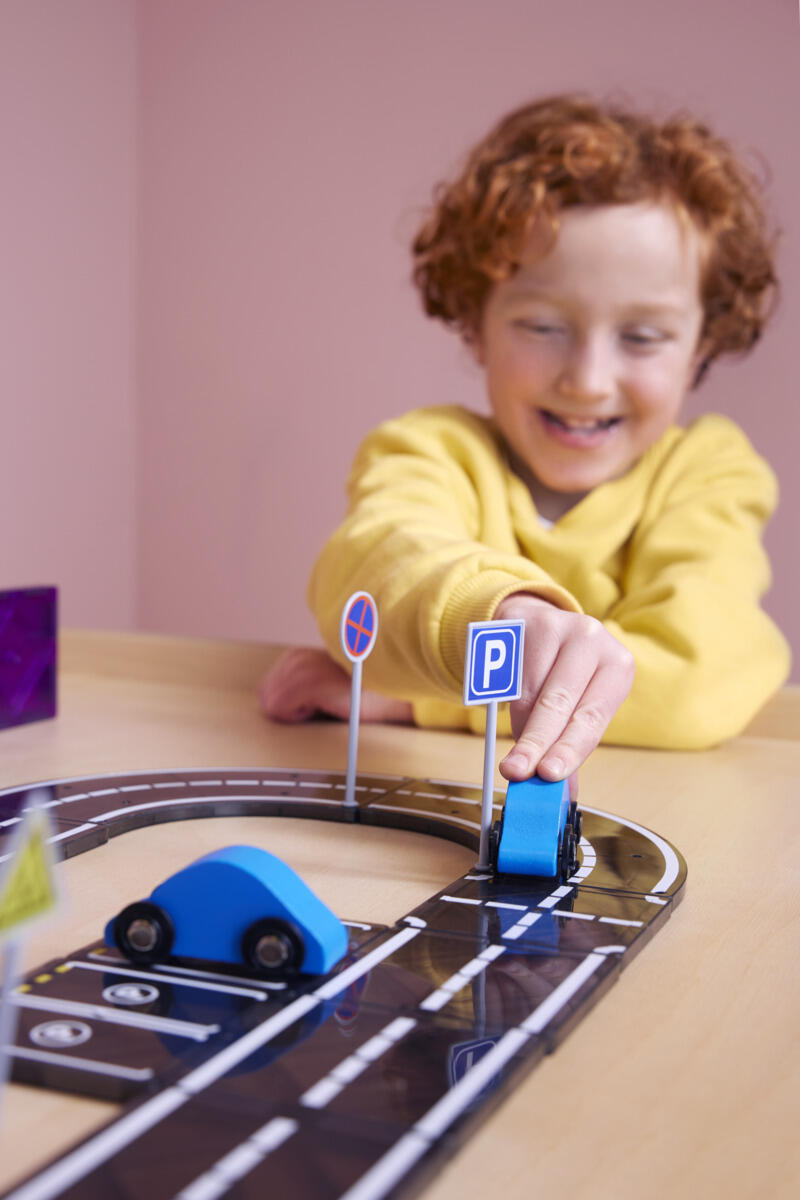 Magnetiske brikker som inspirerer små hender til å skape og konstruere sine egne veibaner. Den elegante svarte platen med dekor er perfekt for å bygge spennende veier. Dette settet inneholder 4 treleker, rette veibiter, korte og lange svinger, parkering, trafikkskilt, trafikklys og trær. Mål på bil: 7 cm. Laget av ABS. PVC-fri. Fra 3 år.